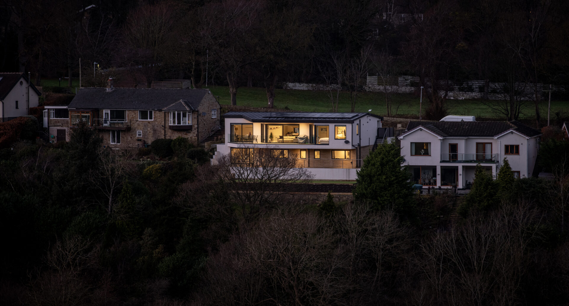 The floating upper floor space is a wonderful design statement and the combination of Yorkshire stone, light render and our anthracite grey frames have combined to great affect to create a stunning home. The main benefits to this property are undoubtedly the stunning views & our floor to ceiling glass windows and doors have ensured that these are always kept in view, while our sliding doors allow the homeowners to lead out onto their external patio area to really embrace their homes’ beautiful location.