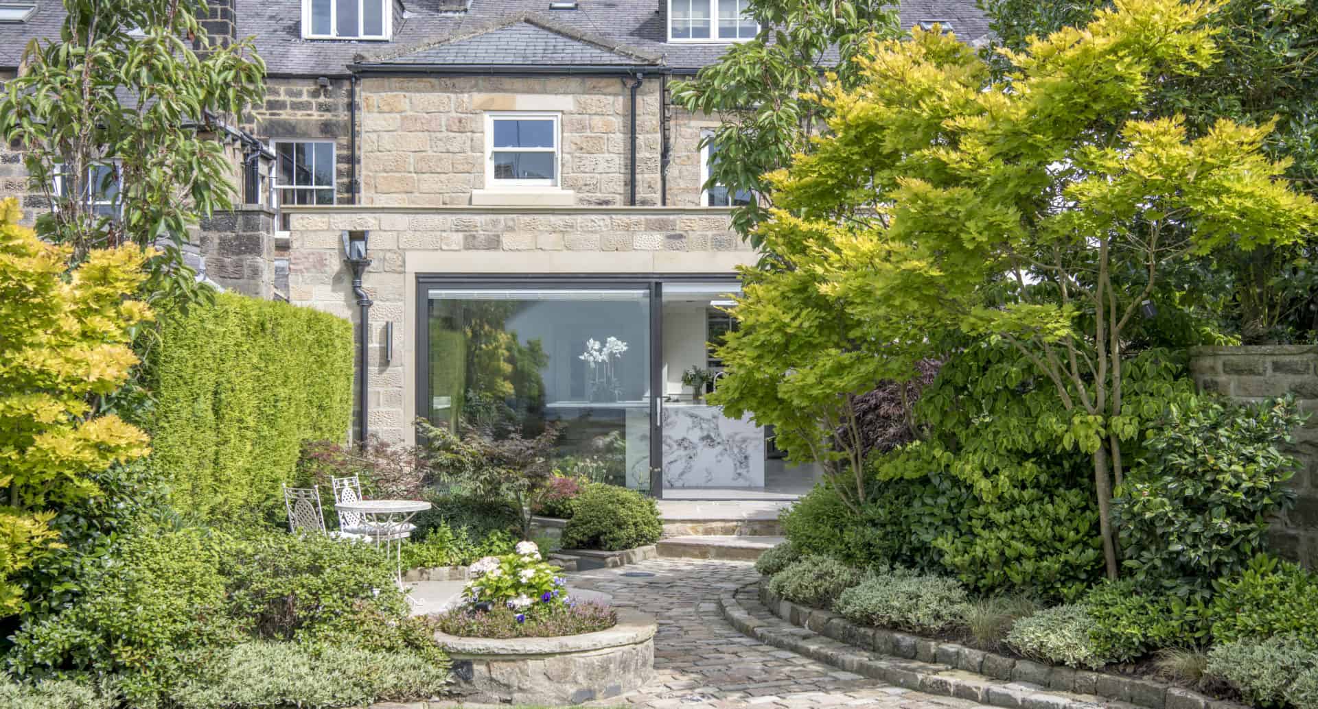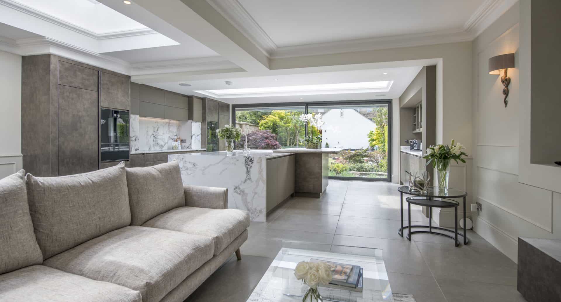 Increased space and light are a common driver for our products, this project shows that by extending your home and removing the existing house walls you can create your dream open plan setting. Here the stunning new space blends the living, dining, and kitchen areas together whilst creating a clear link out to the garden. The rooflights, floor to ceiling doors with a slim 40mm sightline pours natural light into the home that can be controlled at the touch of a button with the sliding doors integral blinds. An immaculately completed extension to this stone-built townhouse that looks classically contemporary inside and out.