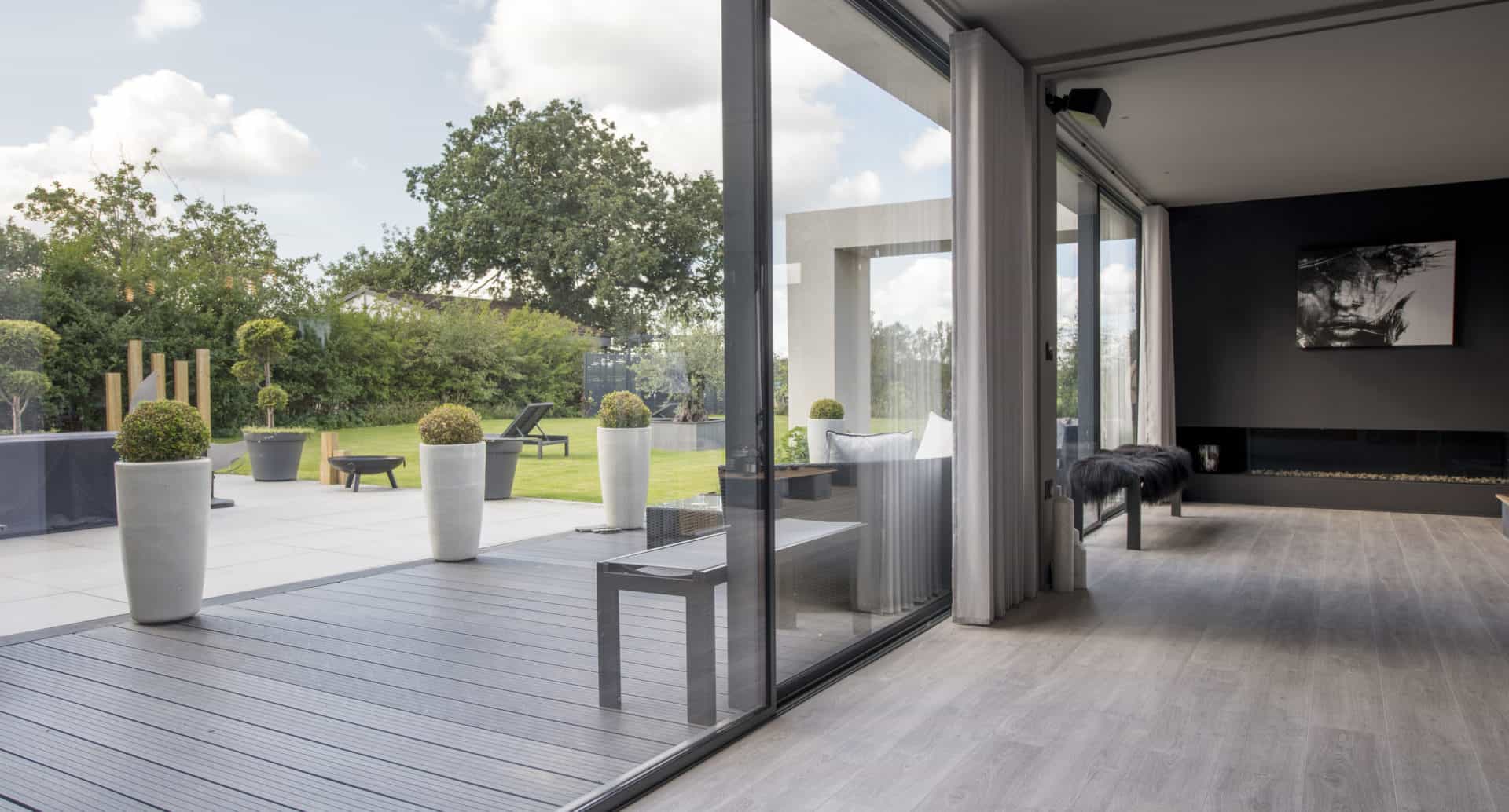 Panoramic sliding doors have been installed on the ground floor with the minimal framework perfectly suited to the contemporary interior space. The slim sightlines of our sliding doors create a clear connection with the garden that gives a real LA feel to this open plan home. Lift and slide patio doors have been used above ground floor. Installed into a more exposed location the lift and slide doors are perfectly suited to extreme weather, the ability to lock the doors in an open position is perfect for allowing ventilation and fresh air into the bedroom space.