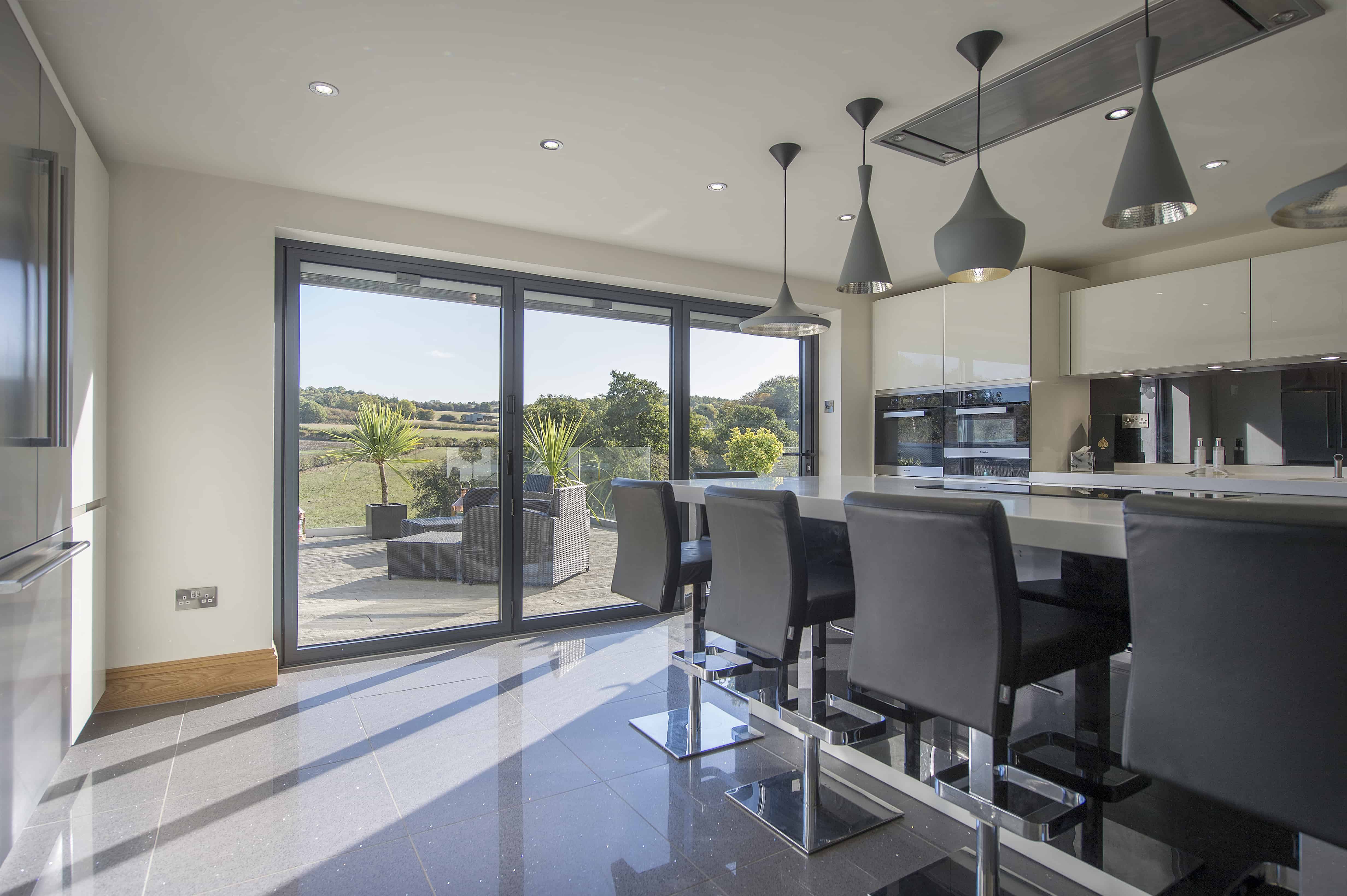 This newly refurbished, immaculate property contains many of our bespoke products. The kitchen has a 3600mm wide, three panel XP View bi-folding door. With the largest individual folding door panels possible, the bi-fold door really maximises the light pouring into the kitchen. The remaining bi-folding doors and French doors within the property have been manufactured from our XP10 door system as they are positioned on different elevations to the XP View and the requirements for smaller door panels meant the XP10 was the perfect solution for the rest of the house. The aluminium casement windows give the old farm house a modern twist, with the slim sightlines looking superb both internally and on the external elevations of the property. The grand entrance to the property is made up of our distinctive Caverro style front door with adjacent glazed side light.