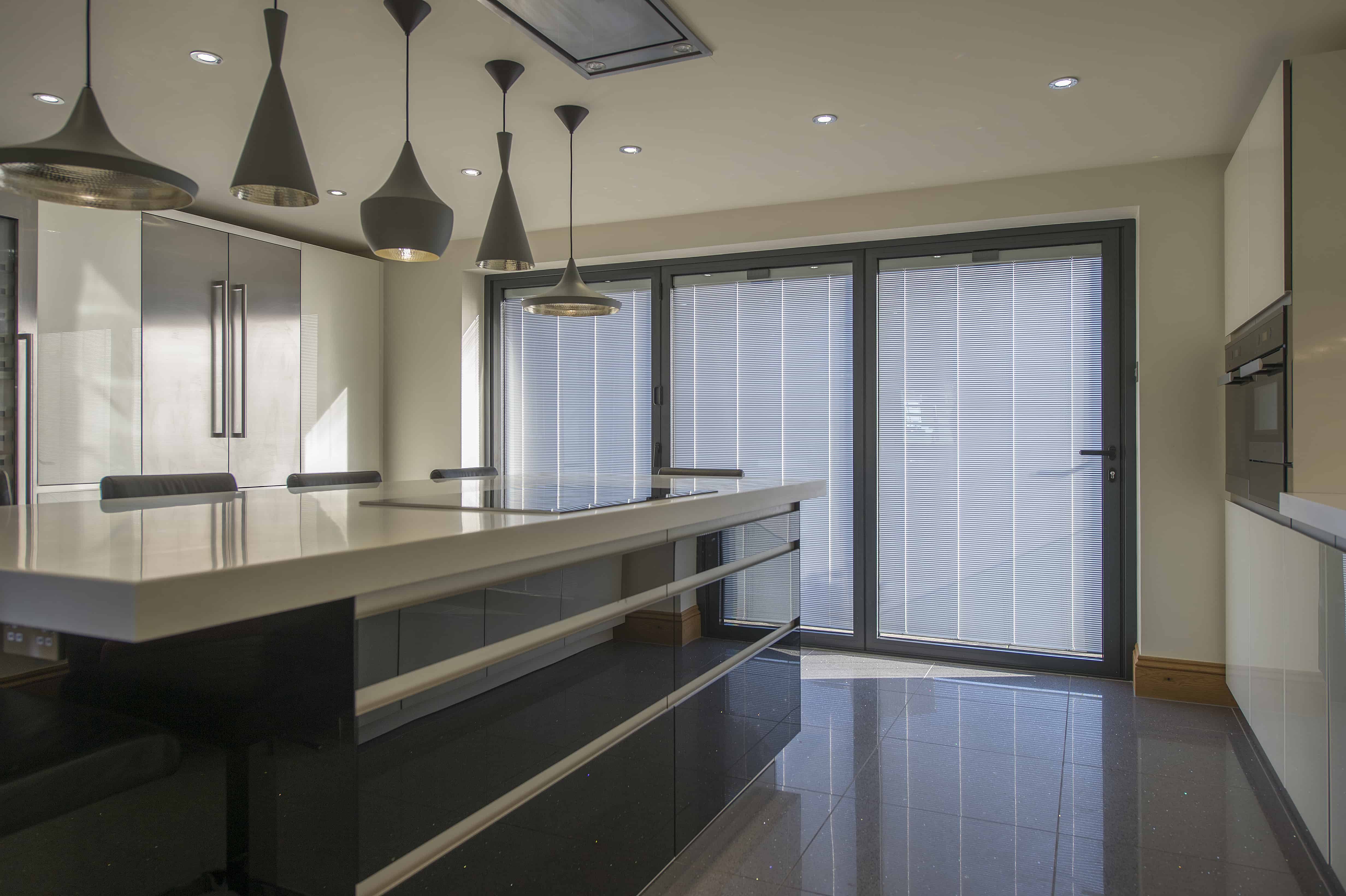• XP View bi-folding door 3600mm x 2185mm with Uniblinds.