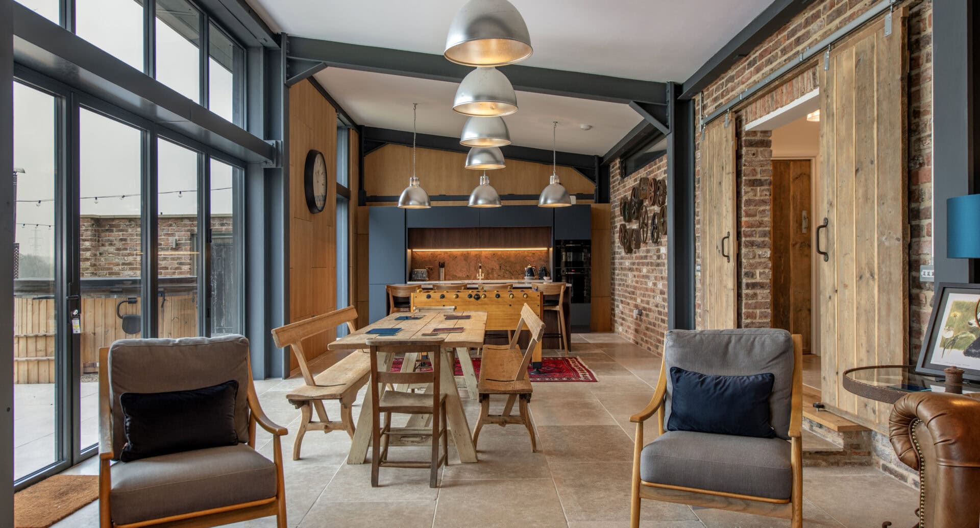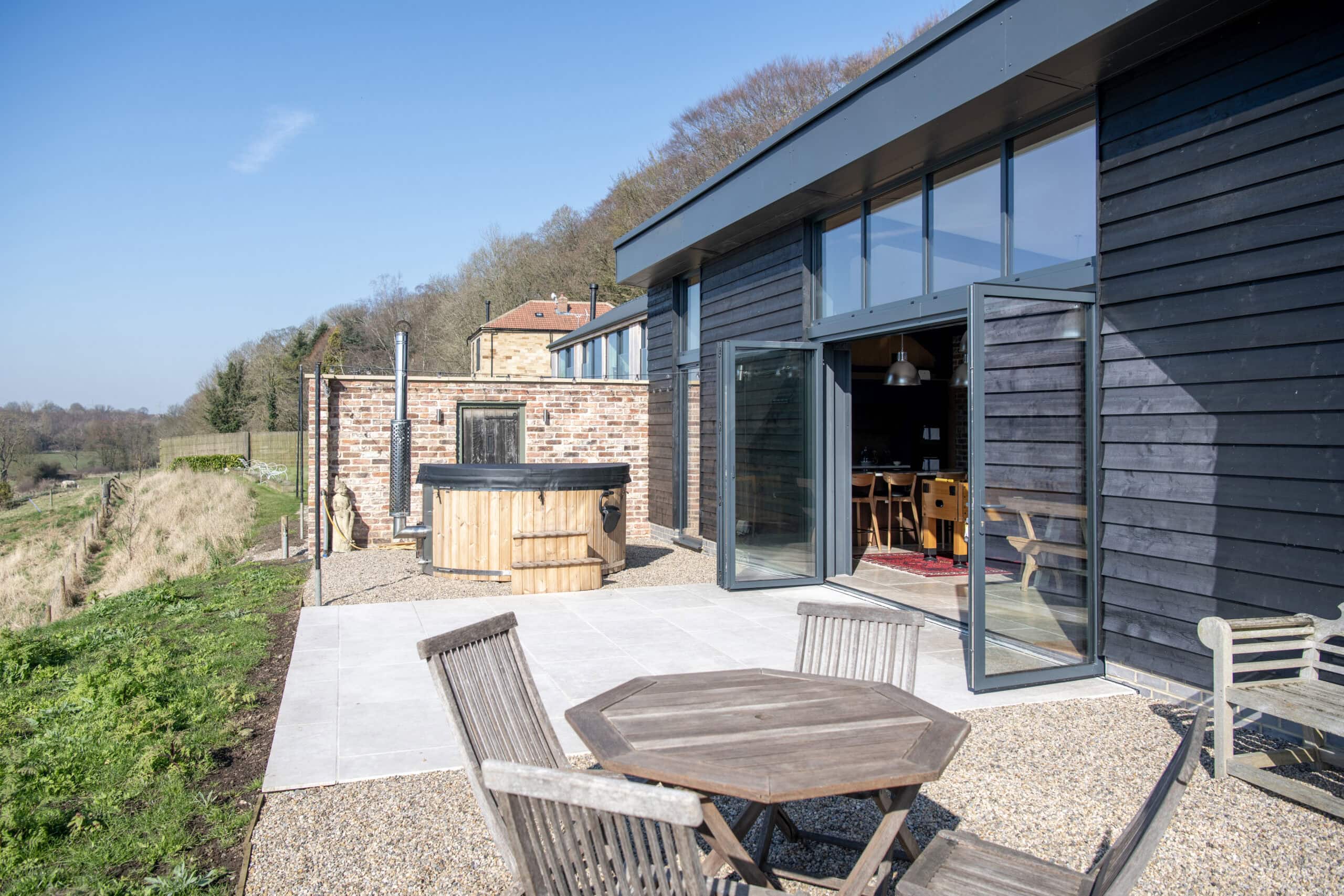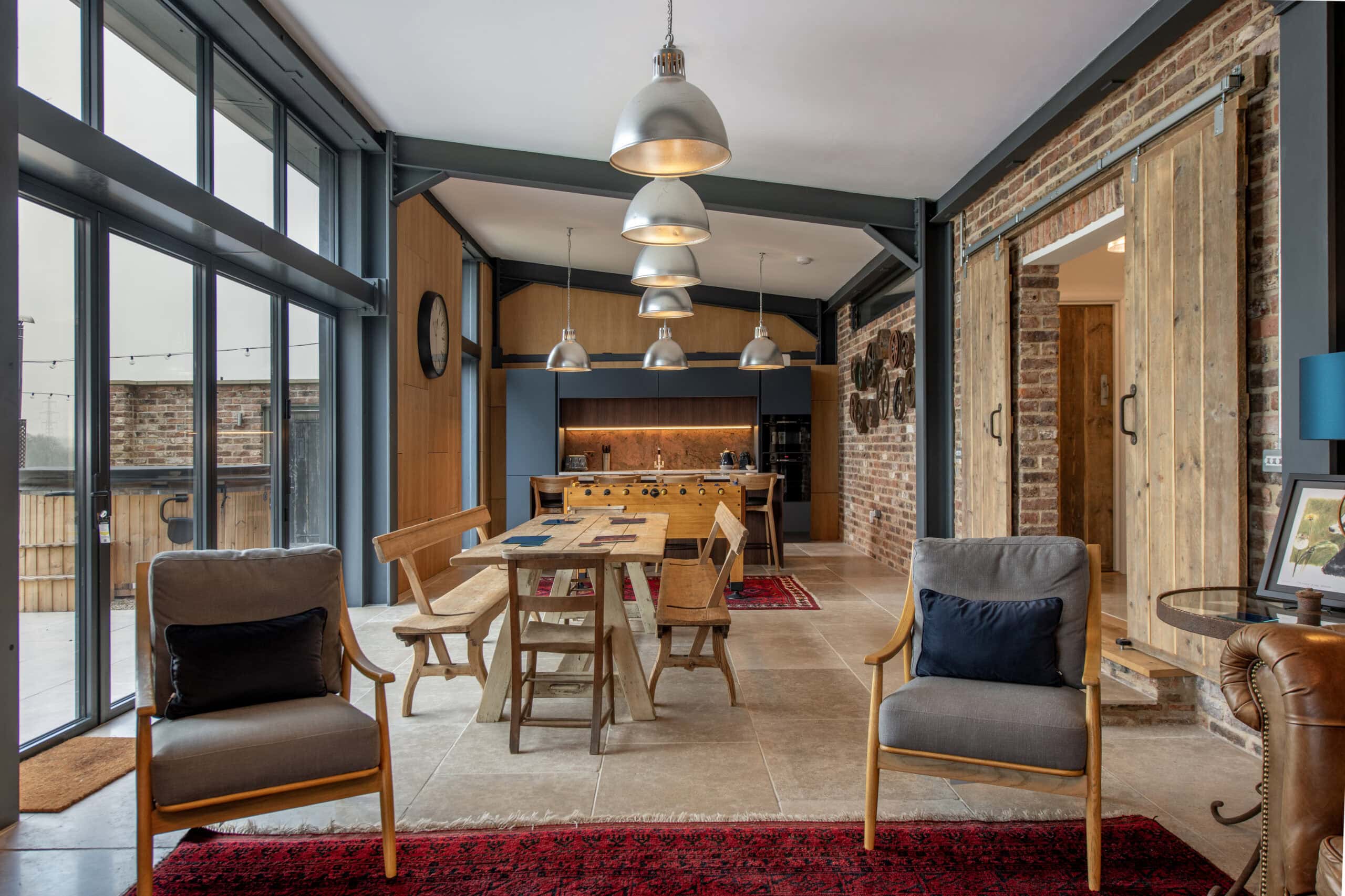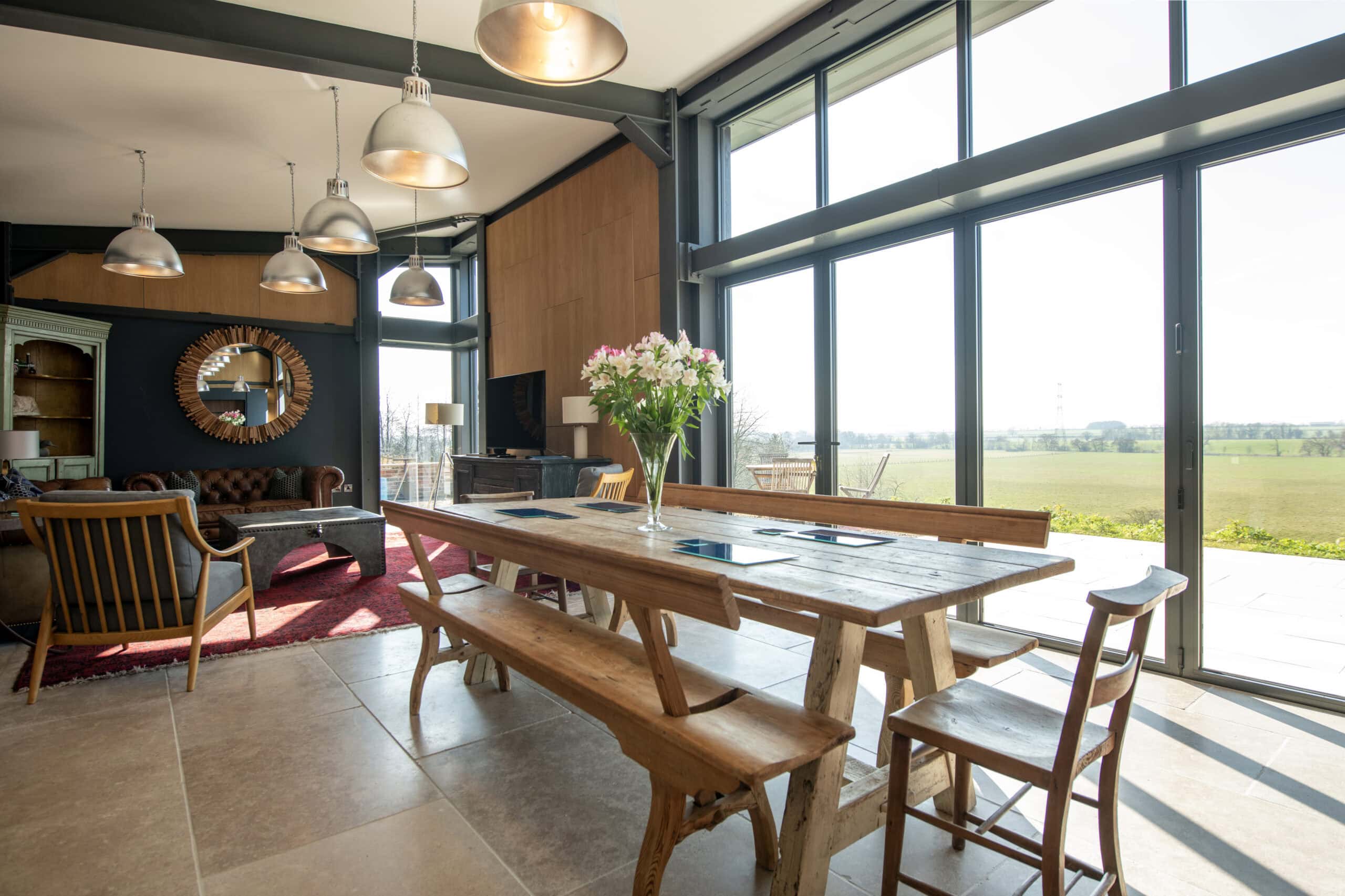 The adjacent holiday home has a pitched roof with the rear elevation taller than the front so bi-folding doors were installed under the structural beams with a fixed top light lining through installed above. The bi-fold doors form the central feature within the rear elevation, bathing the space with light and retaining the contemporary aesthetic from the converted barn. The benefit of the bi-fold doors however is that they can fully open the space onto the patio area outside, instantly making the space larger and drawing the picturesque views into both the indoor and outdoor space.