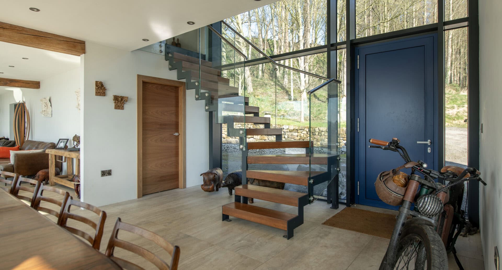 Downstairs a huge open plan space with eight huge panes of glass ensures that light spills into the house throughout the day and the far-reaching views are always in sight creating a natural backdrop to the entire space.