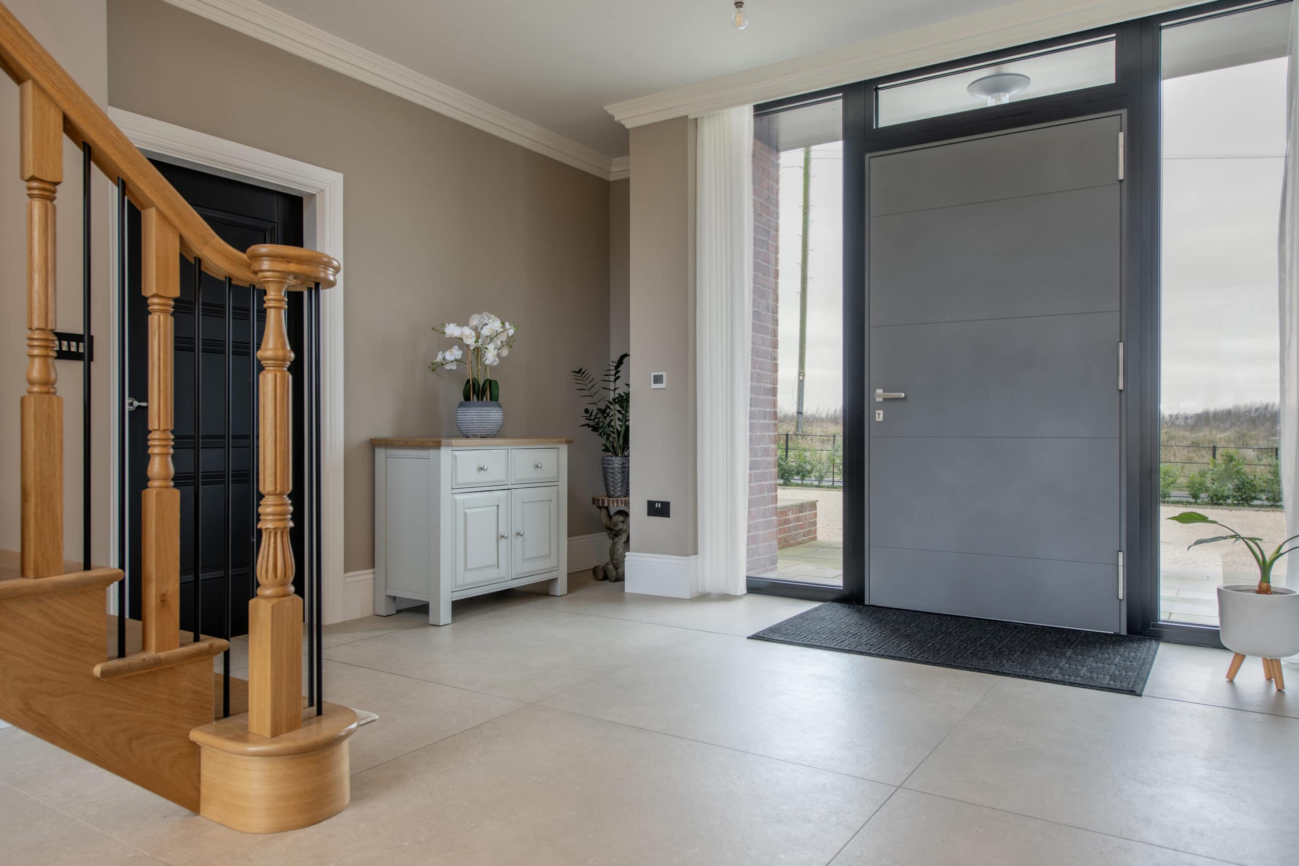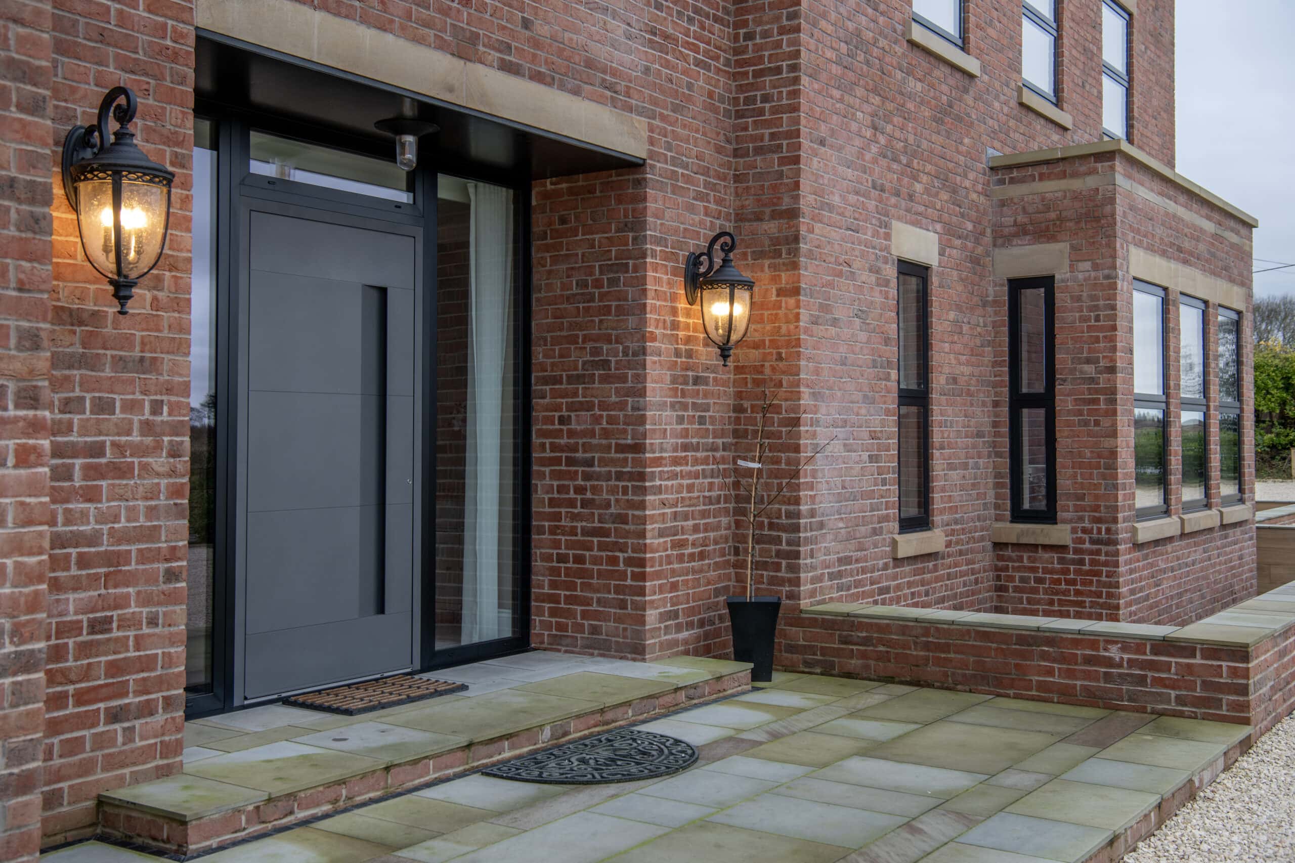 Our statement entrance door adds another contemporary element to the front elevation, while also giving a clear indication of what awaits inside. The door sits centrally surrounded by a glazed top light and side lights. The solid slab door with indented feature handle has been powder coated to one of our Elite colour finishes, while the surrounding outer frame and windows are finished in our standard black RAL colour, a bold choice which gives real standout to this beautiful feature product.