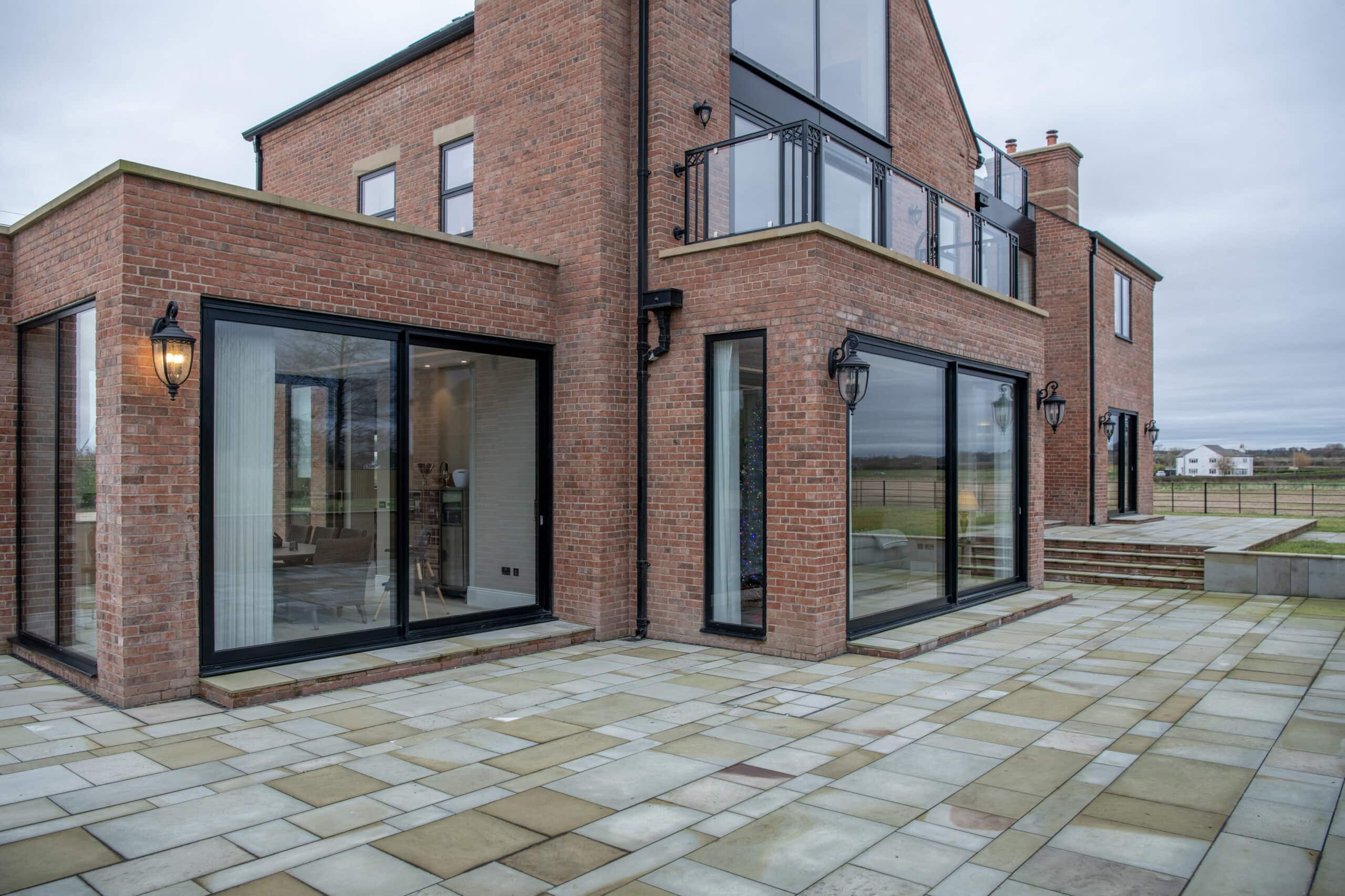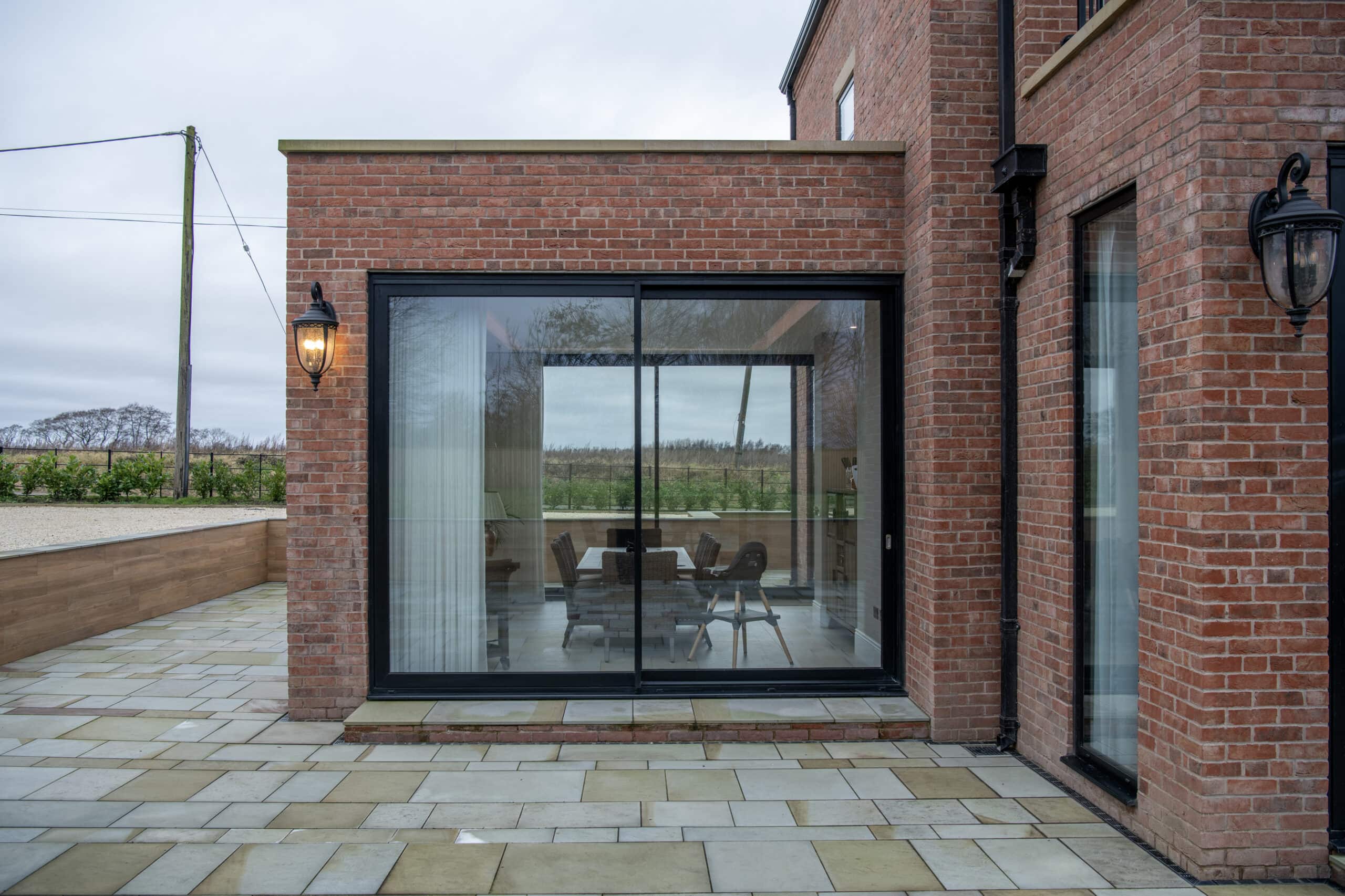 Large glass panels are a fundamental aspect of the house design so sliding doors have been used to connect the home and garden. Sliding doors have been used in the master bedroom and on the second floor to lead out onto an upper floor balcony area. A ground floor door is three metres tall so to retain equal sightlines throughout our premium specification lift and slide door the XP Infinite has been installed throughout the property.