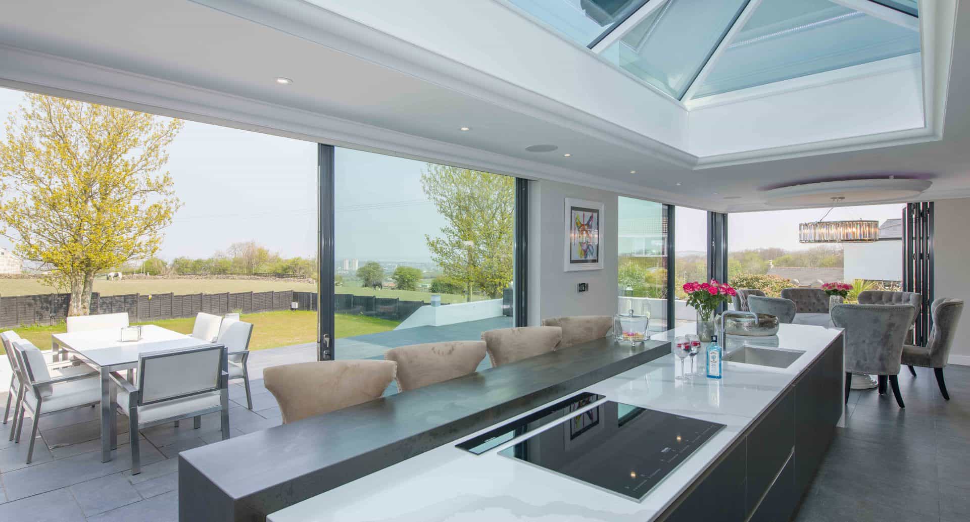 The new extension is dominated by two more feature products. A huge Sky Line roof lantern is the centrepiece of the beautiful new kitchen. The master bedroom contains a floor to ceiling tilt only window, with a shaped gable frame above it, lining through with the pitch of the extensions new roof. The bifold door and Scenic casement windows contain electronically operated Uniblinds, which allow the homeowners to close off the side elevation for privacy from the neighbours. The whole property, particularly the new extension is completely flooded with natural light and masses of glazing that allow the homeowners to enjoy the landscape views in nearly every room of the home.