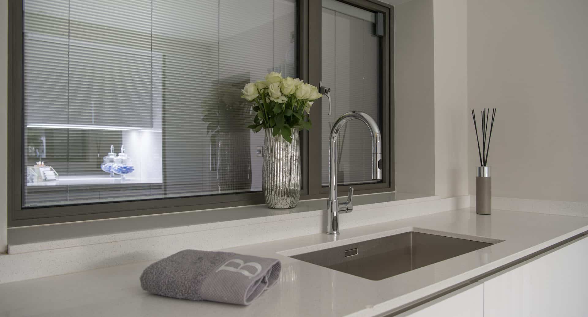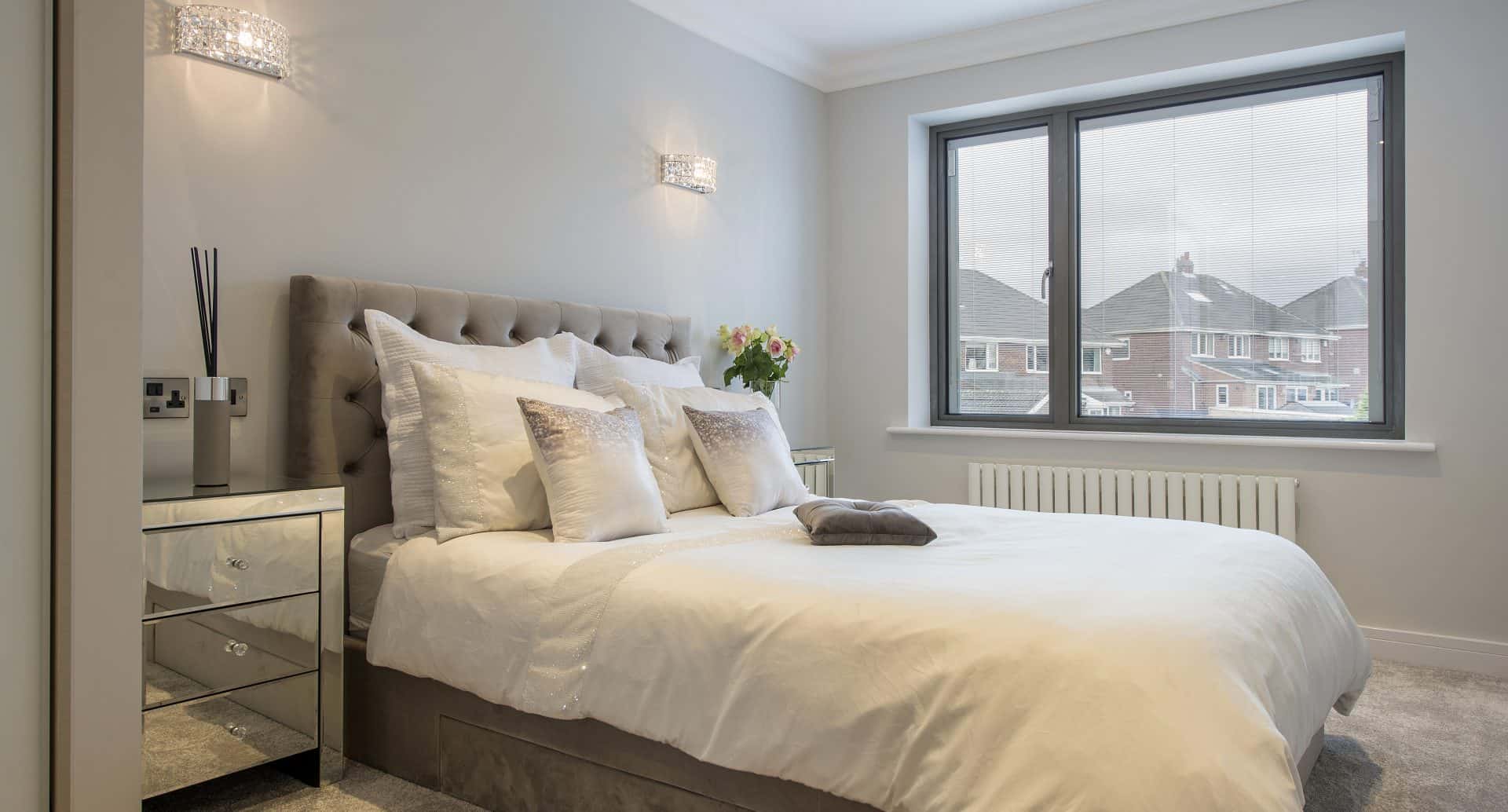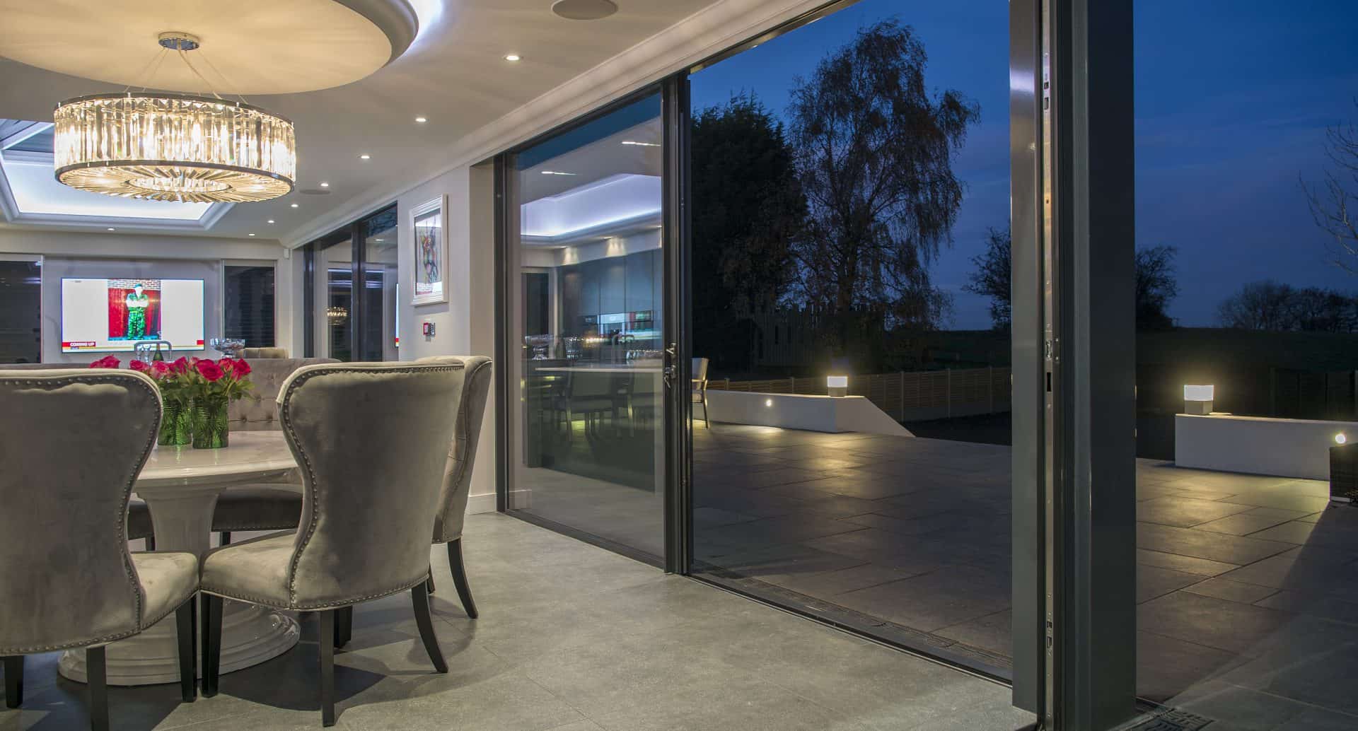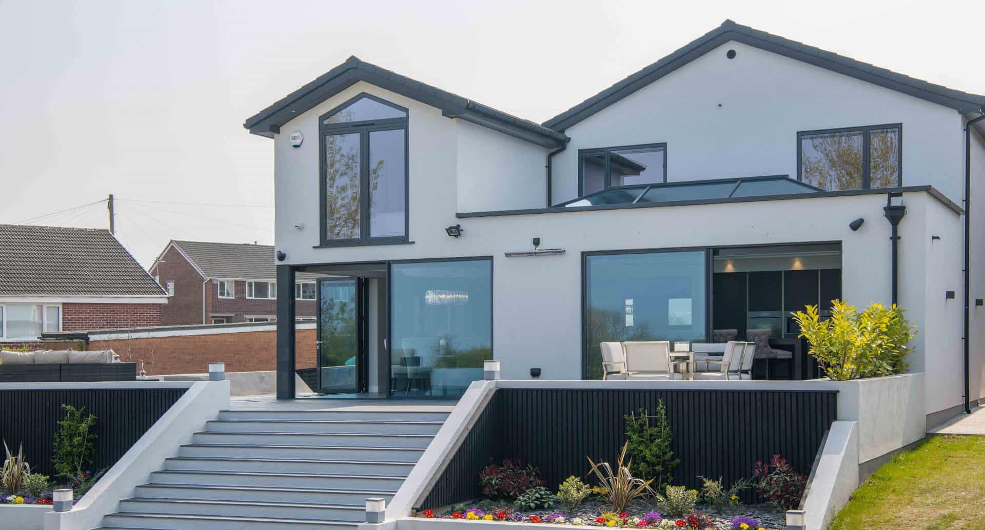 The rear elevation of the home contains products in a different colour and finish altogether. The colours within the home are all neutral so the homeowners opted for our gloss finish, elite colour in granite for the doors and windows throughout the rest of the home. Boasting a detailed finish not dissimilar from a granite worktop, the granite colour looks stunning on the huge XP Slide Panoramic doors that combined span almost ten metres across the back of the house. The new bedroom looks like it is floating, sat on a steel corner post that has been expertly cladded with bespoke, insulating pressings. The corner can be completely opened with the XP View bi-folding door and sliding door moving away from the post, creating an al fresco dining area or a clear pathway to the patio furniture outside.