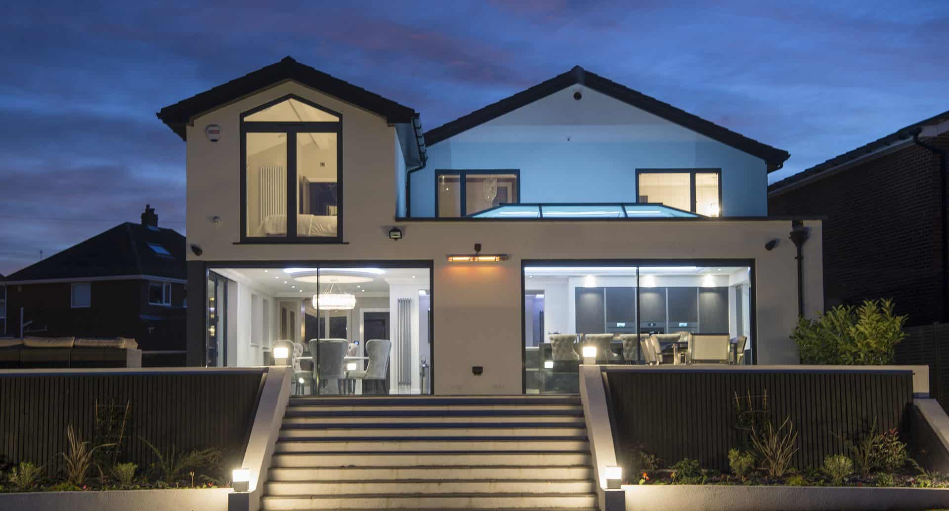 Express delivered glazing solutions throughout the whole house, all of which was chosen by the homeowners in a very design led approach. The front of the house contains our premium Scenic casement windows boasting slender frames, in our elite colour Mocha, housed with solar powered integral blinds downstairs and manual sliding integral blinds upstairs. The feature entrance is dominated by our Linora front door with adjacent sidelights, which is both strong and secure, and the perfect centrepiece for the front of this modern home and inside within the contemporary hallway also. The flat roof area at the front of the house contains an XP Skyview skylight to maximise natural light into the new gym area. The textured Mocha finish was chosen because the homeowners wanted the front of the house to look completely unique, so a grey RAL colour for the door and windows was deliberately avoided.