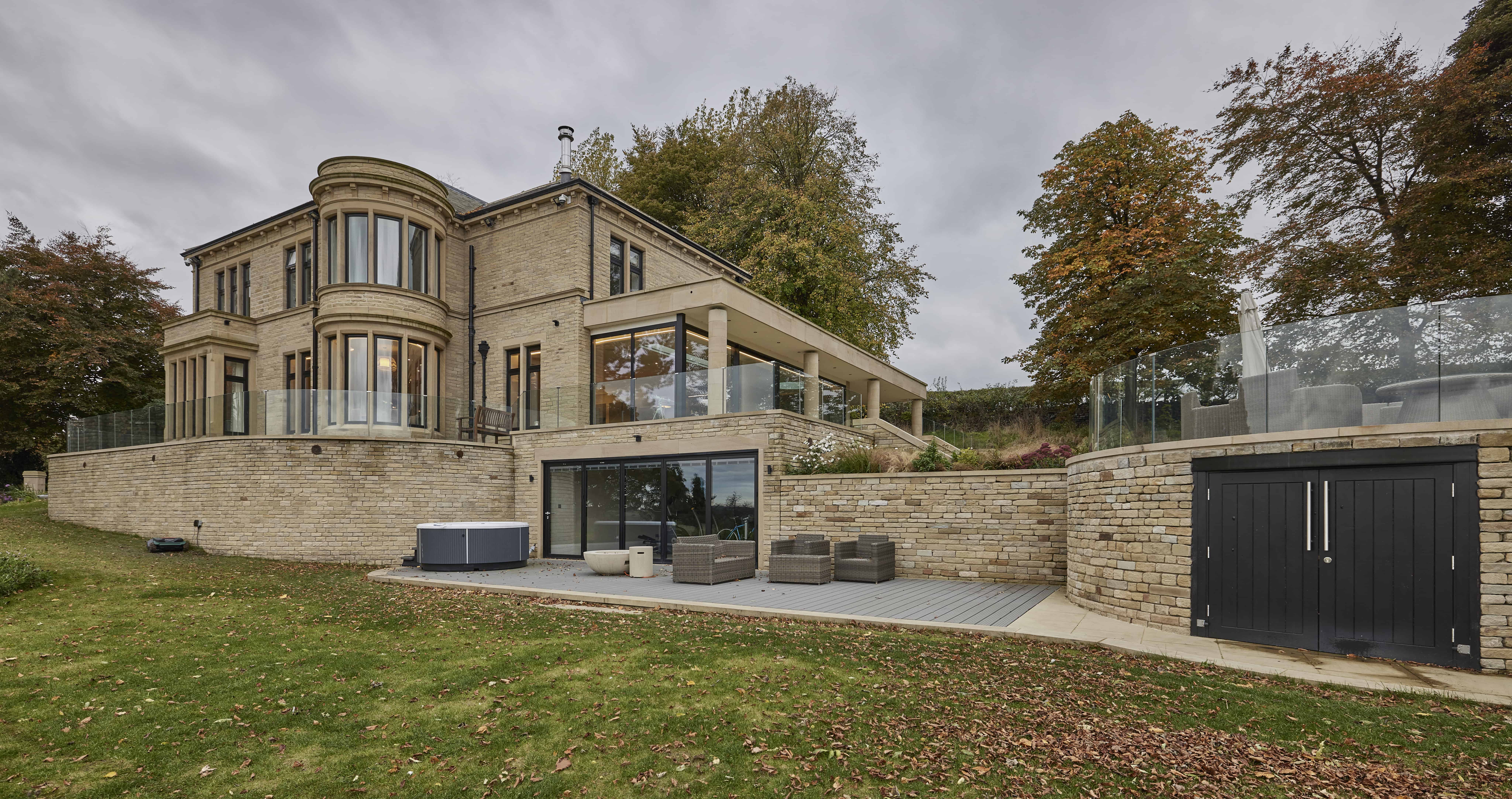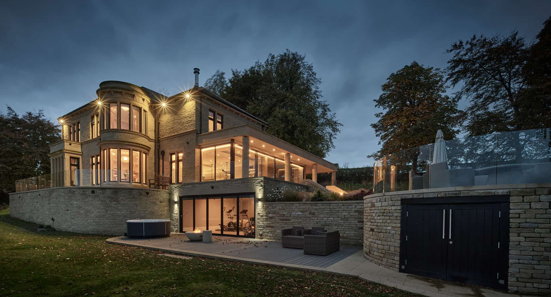 The basement gym area naturally lent itself to bi-folding doors. The tall doors with wide panels create an impressive glass façade to screen off the gym area. The master door allows for simple access in and out of the gym, whilst the design of the outside space ensures the gym benefits from privacy from the neighbours and shelter from the elements, which allows the gym area to be completely opened in the warmer months. The external patio boasts a hot tub and ample space to bring the workout outside into the fresh air, a little bit of dream California living right in the middle of West Yorkshire.