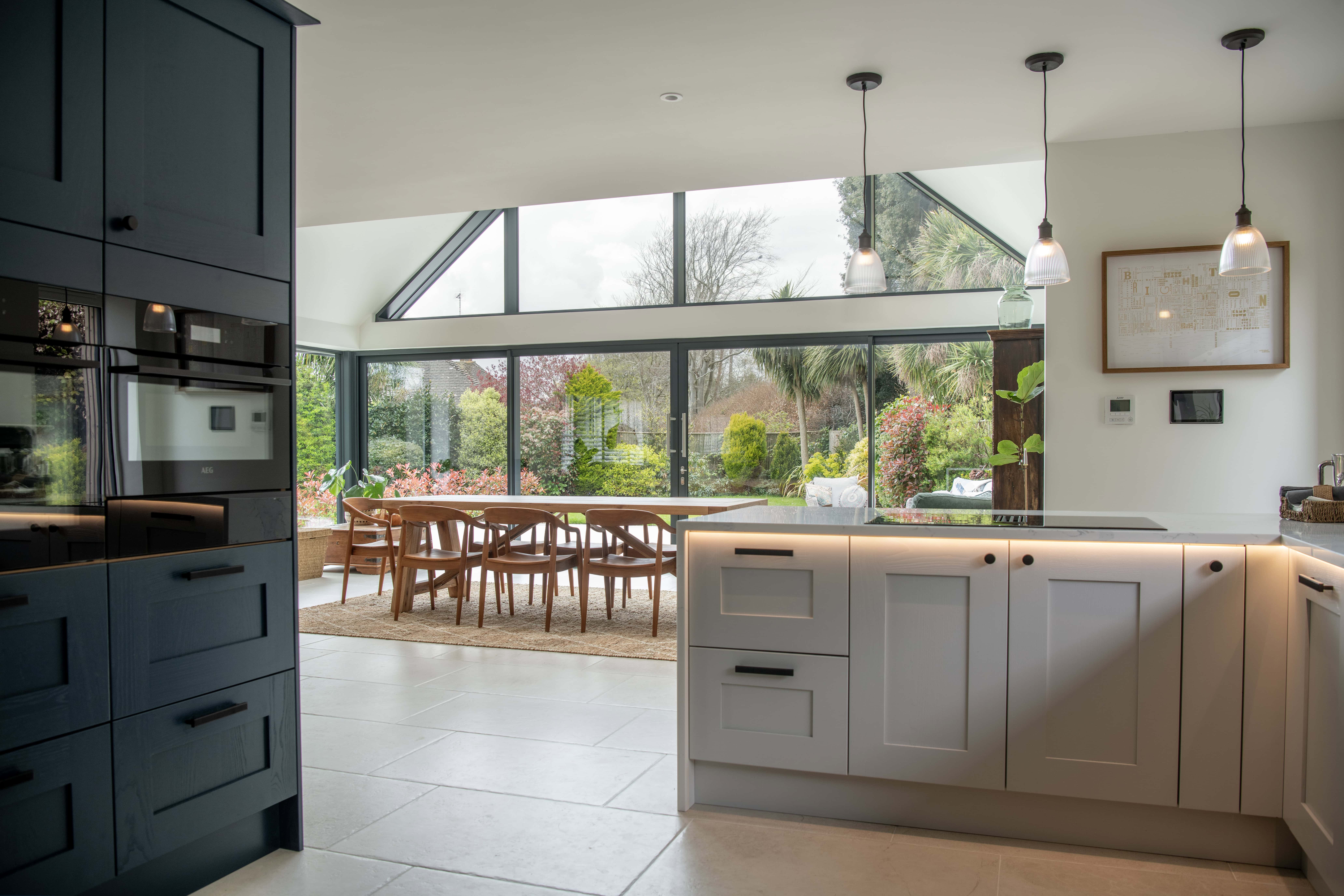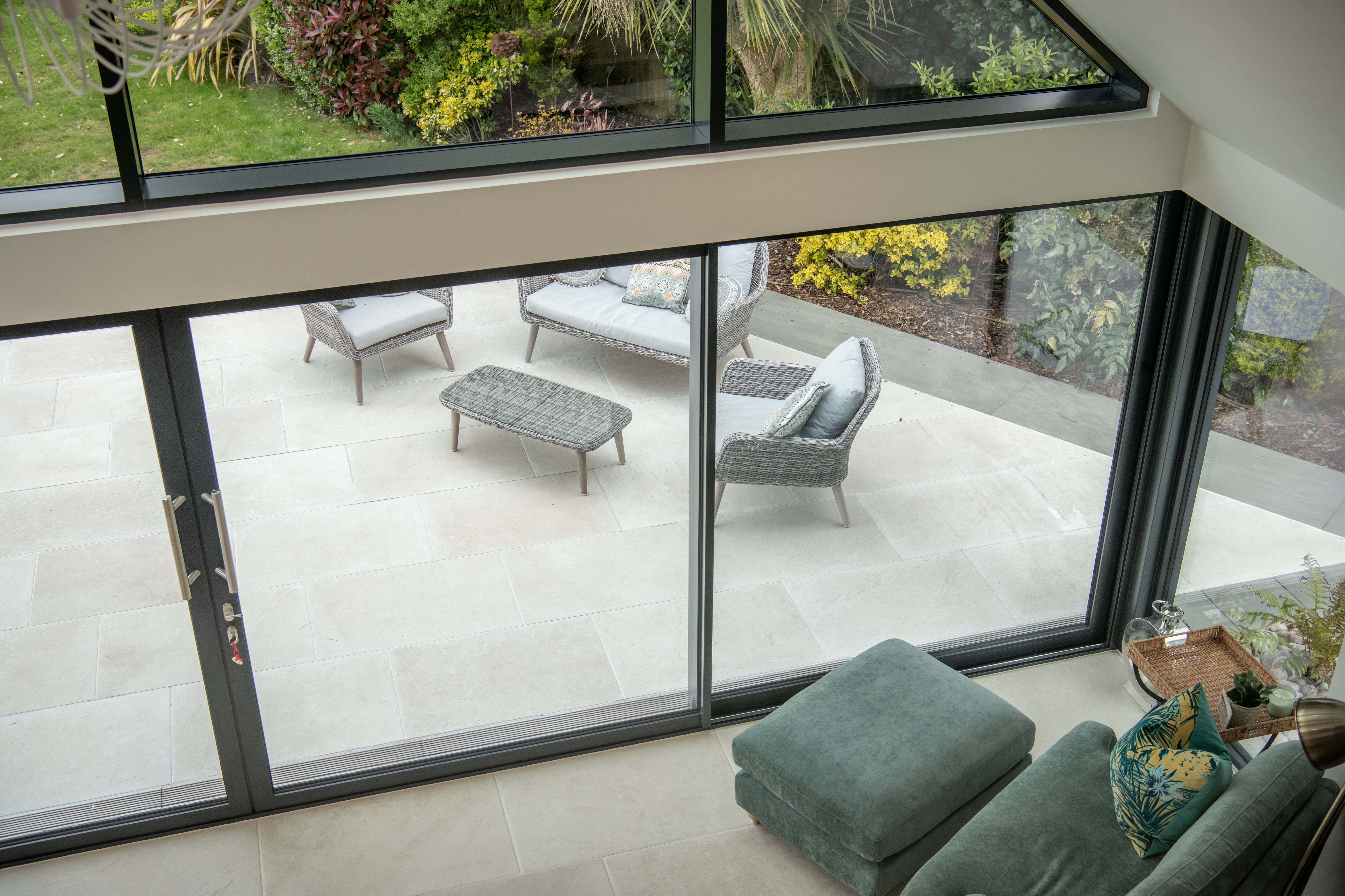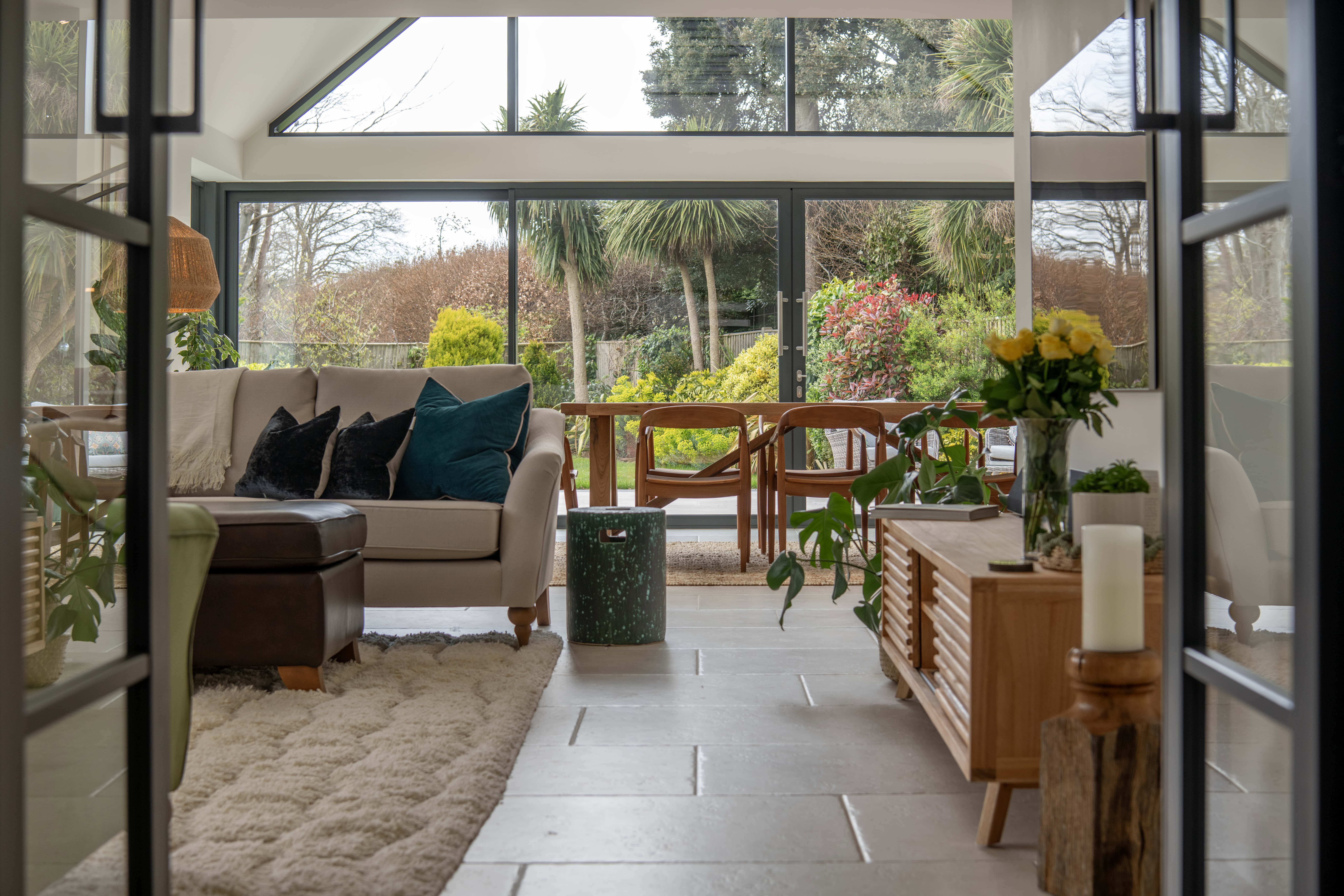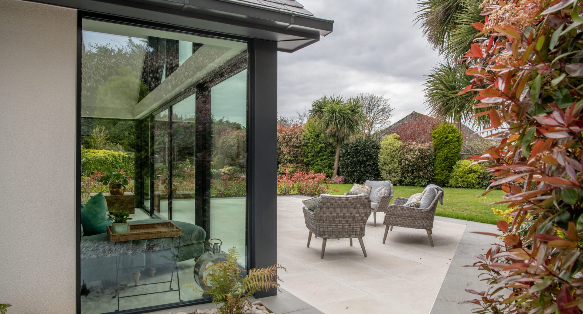 The twin track sliding doors contain four panels with the middle two sliding to the side to create a 50% clear opening allowing a seamless connection between home and garden. Even when the doors are closed, the connection between home and garden remains with the four glass panels framing the garden views and creating a stunning glass façade with a natural backdrop. The external patio area sits flush with the inside floor level so the whole space flows from inside to out, with the requirement for inside and outside living wonderfully achieved within the most impressive of settings.