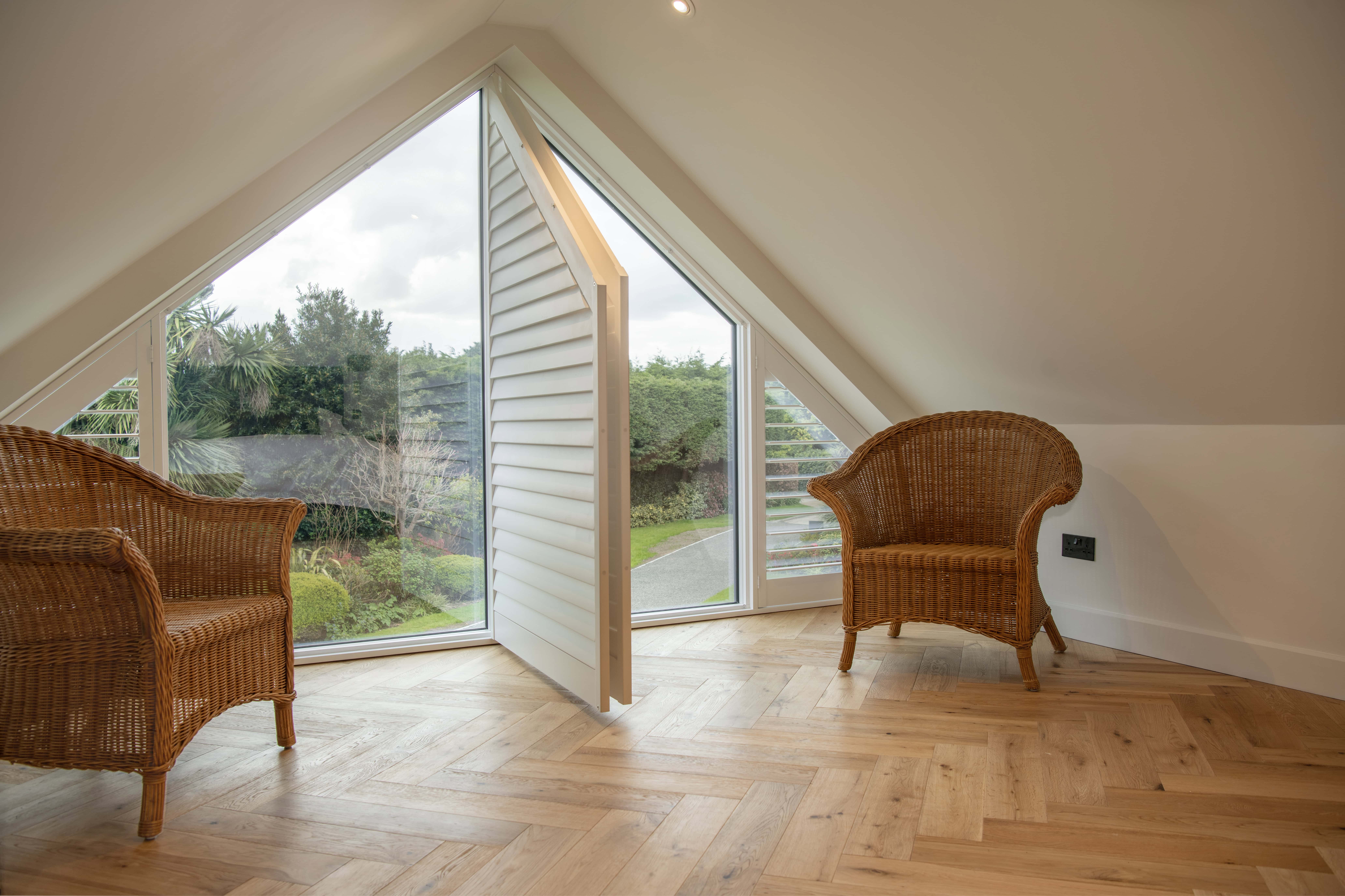This bungalow contains dormer lofts and vaulted ceilings so naturally lends itself to shaped windows. The front and rear elevations both contain a feature shaped window, both of which are stunning against the respective render and cedar cladding exterior finishes. However, it is inside where the benefits are really seen with the shaped windows taking full advantage of the increased ceiling height and bringing in even more natural light. The side extension is the main feature within this property, with a heavy-duty curtain wall screen creating a huge, shaped window that sits above our sliding doors to create a distinctive architectural feature within this already impressive home.