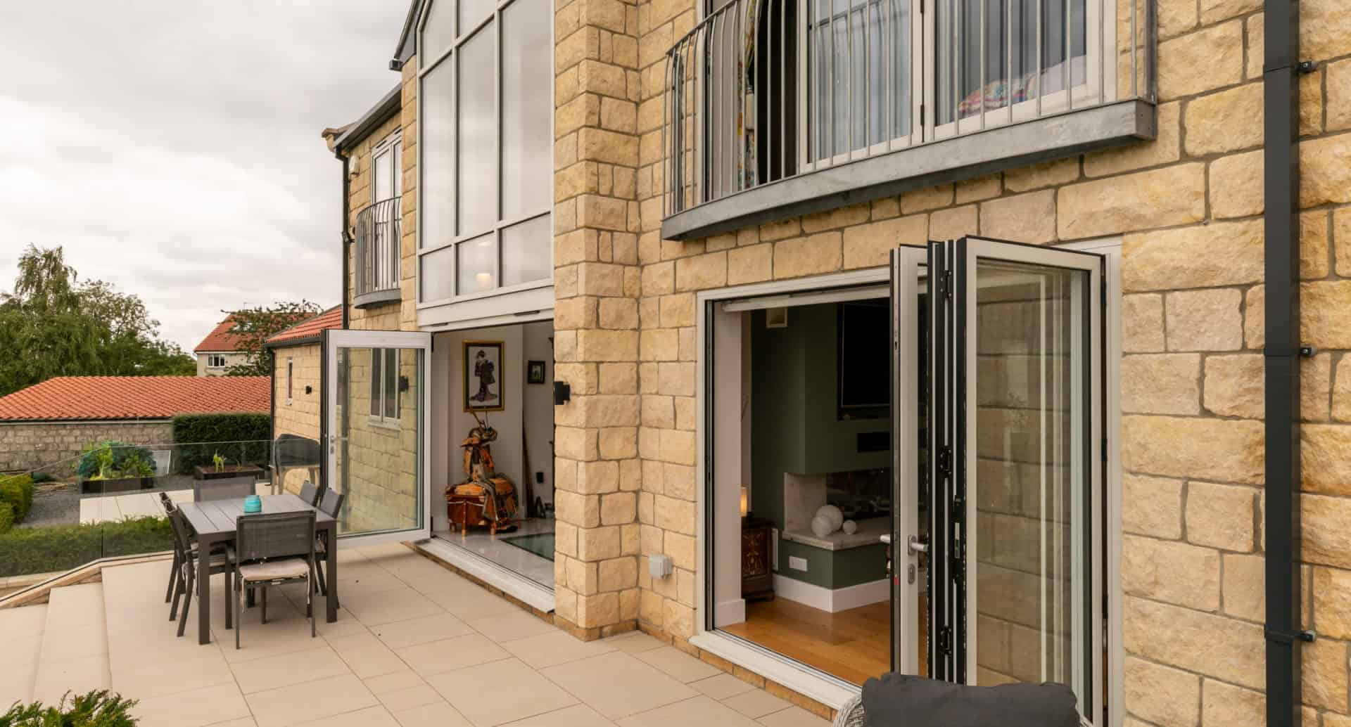 We worked closely with the homeowner’s project management to ensure that our installation tied in with their build schedule. To expedite our manufacturing process, we ordered all the required RAL coloured profile ‘Off-Plan’, so we had the materials ready to manufacture as soon as the site survey was carried out. The survey took place once was outer structure of the house was built and we commenced the bespoke manufacture immediately because we had previously ordered RAL coloured profile. We supplied the aluminium entrance doors, and aluminium windows throughout. The unique design of the house includes three ground level sets of our XP View bi-folding doors, including a set at the front of the property. The house sits within immaculate landscaped gardens and the grand entrance area includes an outdoor seating area so a morning coffee or evening meal can be enjoyed when the sun is rising or setting.