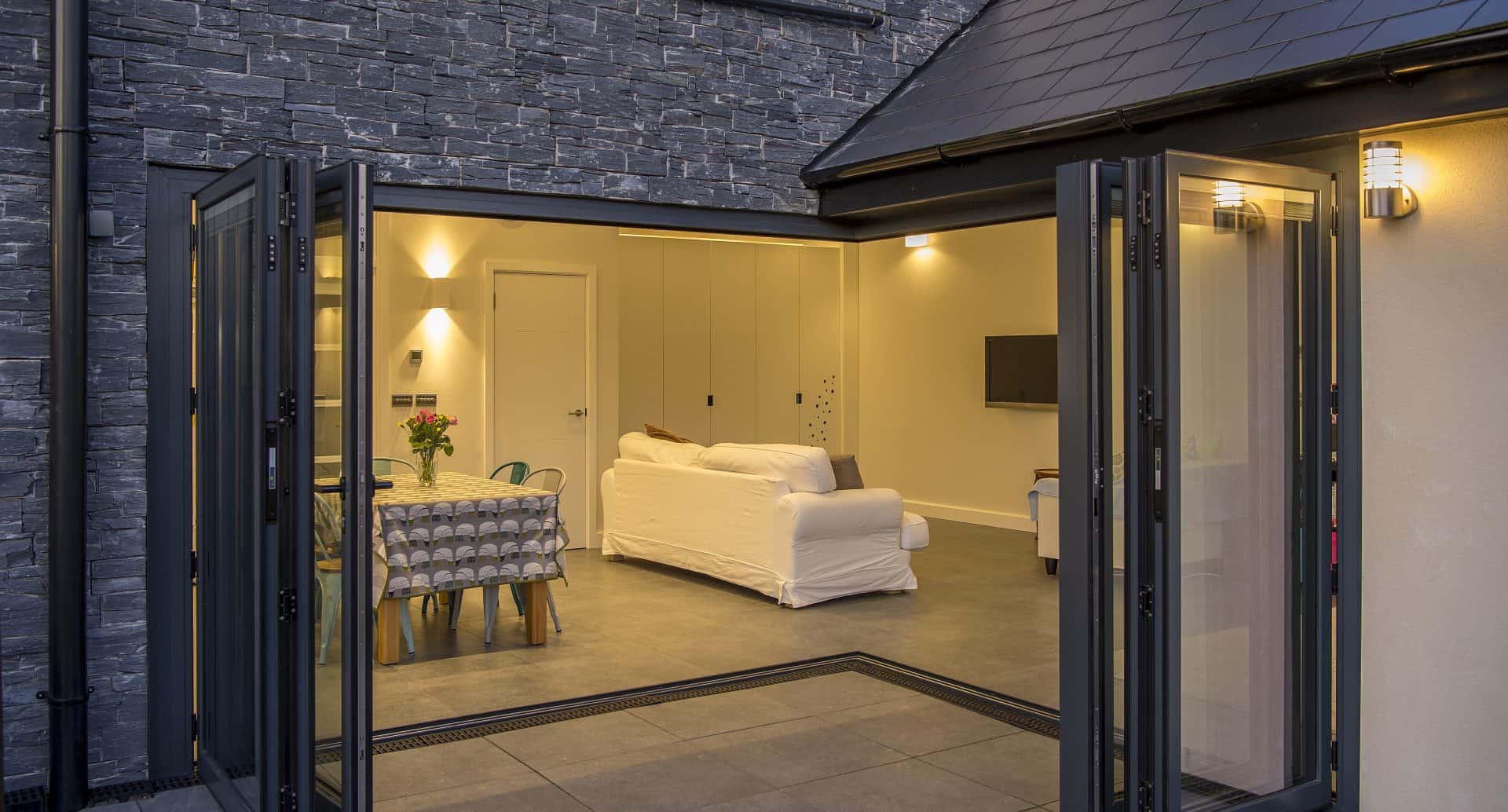 The new extension boasts a large cantilevered steel, which has allowed for two bi-folding doors to be installed together without the need for a structural corner post. Typically, two doors will meet at a fixed post which is cloaked in aluminium, but this project has the additional wow factor of the post folding away with one of the bifold doors. This stunning architectural detail means a much smaller post and sightline when the doors are closed but they also open-up completely, creating an impressive broad open corner. The two-moving corner-post folding doors include electronically operated integral blinds. The blinds sit within the glass themselves and are controlled by a remote control. The blinds never need cleaning, can screen off the living and kitchen space at the touch of a button and literally fold away with the doors when they’re opened, alleviating the need for an external curtain rail or external blinds. We can offer a moving corner post solution with two bi-folding doors each boasting an odd number of folding door panels just like this one. We also offer a moving corner post solution with our sliding doors also so if your architects plans include this bespoke solution then contact our sales team and we’ll be happy to help you.