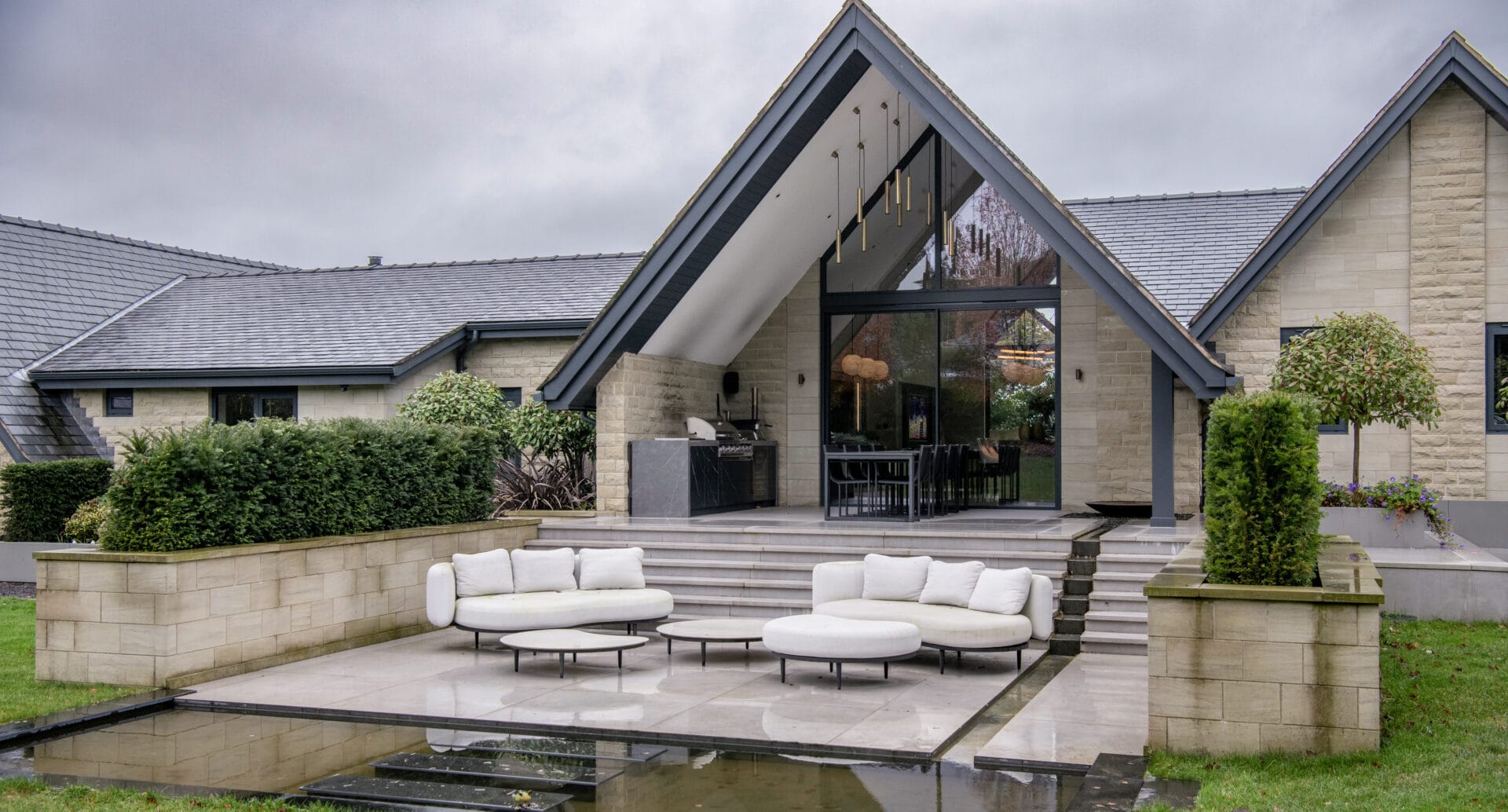 The rear elevation is arguably slightly more modern but retains the warm and inviting feeling achieved on the front. The dominant feature within the rear elevation is our twin track sliding door that sits below a shaped gable mirroring and flowing through from the front elevation. This has been expertly designed to allow the homeowners and visitors to look through the whole house from the front elevation balcony. Leading into the house from the balcony is an opulent snug area that can be walked straight through, out onto the level patio and external dining area and down the stairs onto the lower outdoor area, surrounding by a water feature that leads out onto the lawned garden.