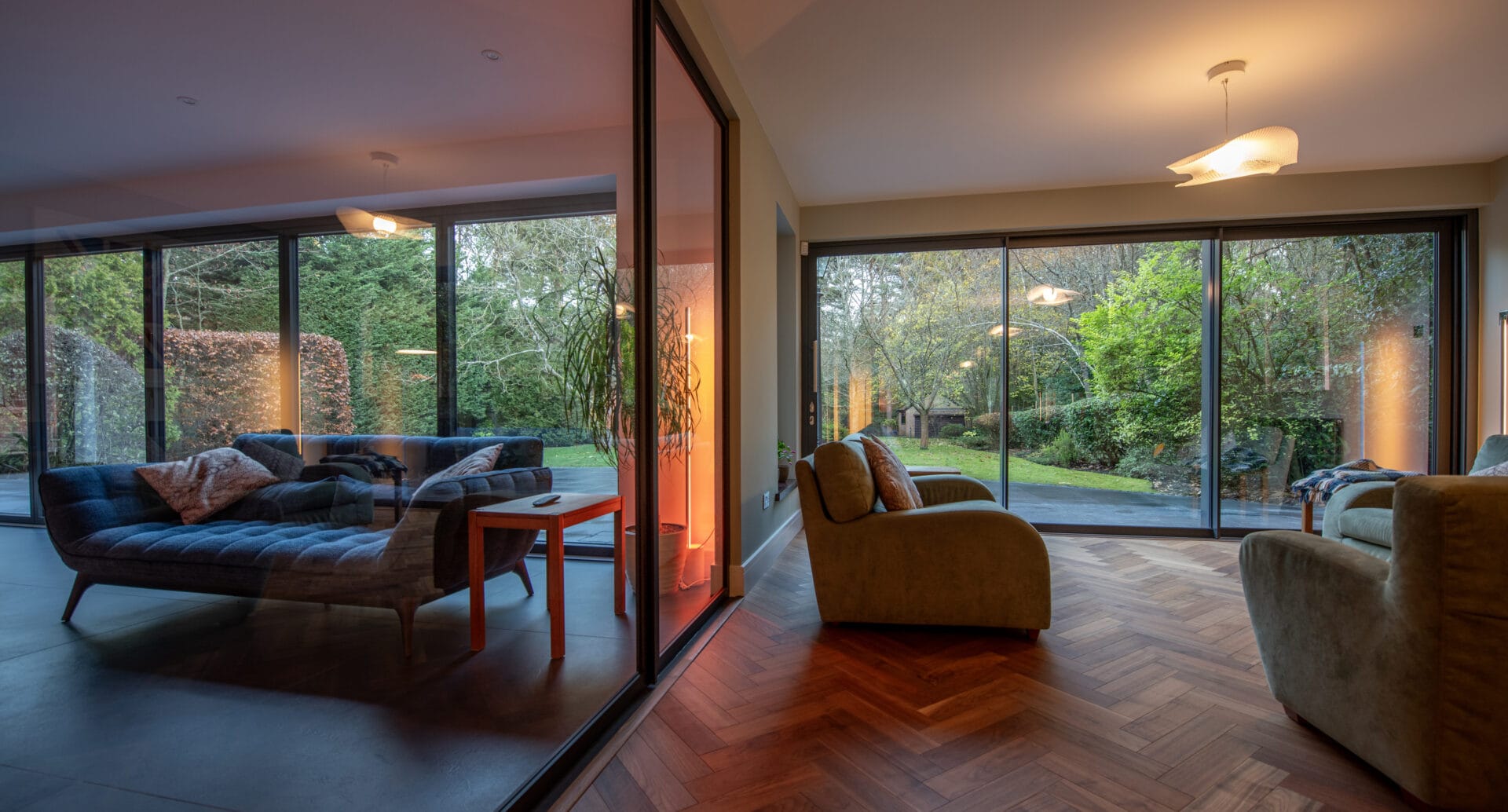 The upper floor XP Glide doors act as a full height window sat under striking timber beams that lead out onto a balcony area. The ground floor doors form the glass backdrop to a snug area, the perfect intimate space to enjoy an afternoon read or an evening with friends.