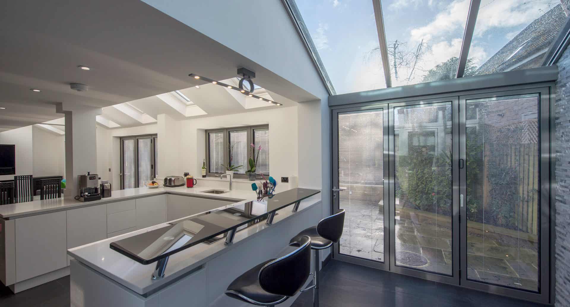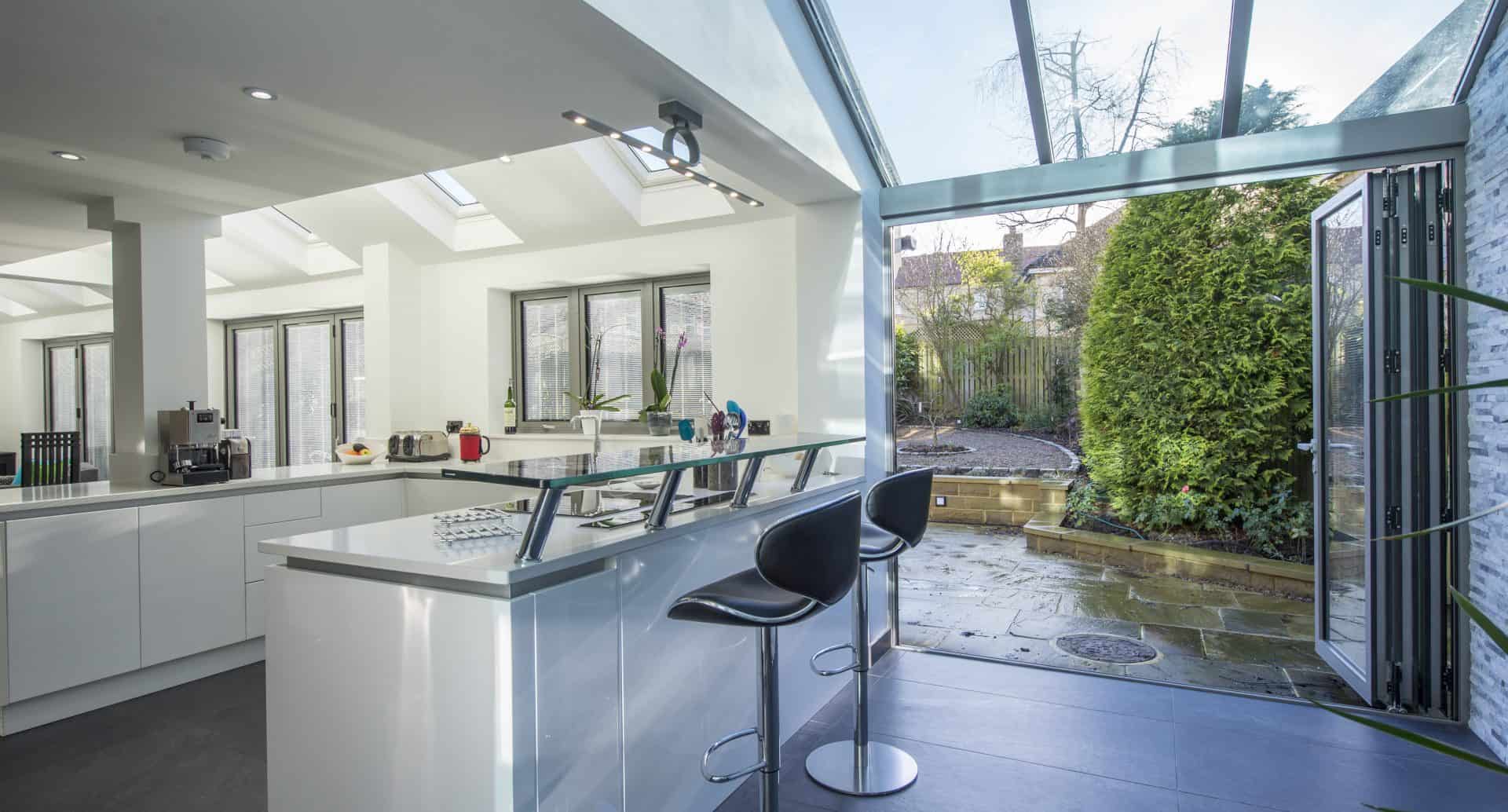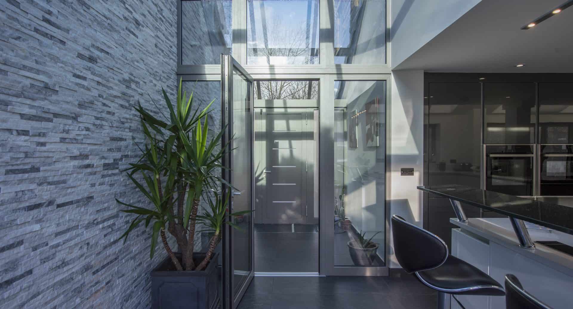 The owners wanted to put their own stamp on the property by replacing some of existing products. They wanted to add a contemporary look to the front of the property with a new front door, and a glazed atrium linking the front and back of the house. The atrium also acts as a light filled gateway connecting the main house to the garage. The clients wanted the rear of the home to be as open-plan, light and modern as possible.