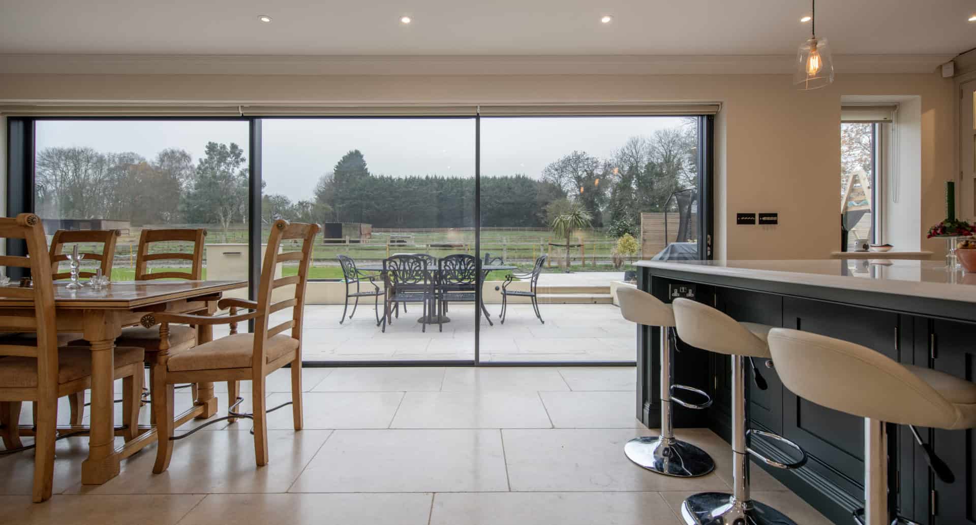 The central feature within the home is our large triple track sliding door. The glass door is positioned in the middle of the main house as part of a large open plan kitchen, dining & living area and perfectly frames the Oxfordshire farmland views. The exterior area has been perfectly landscaped with an immaculate outdoor social and play area, which flows through perfectly from the inside of the house, creating a continuous floor level that flows out from the house to seamlessly connect the home and garden.