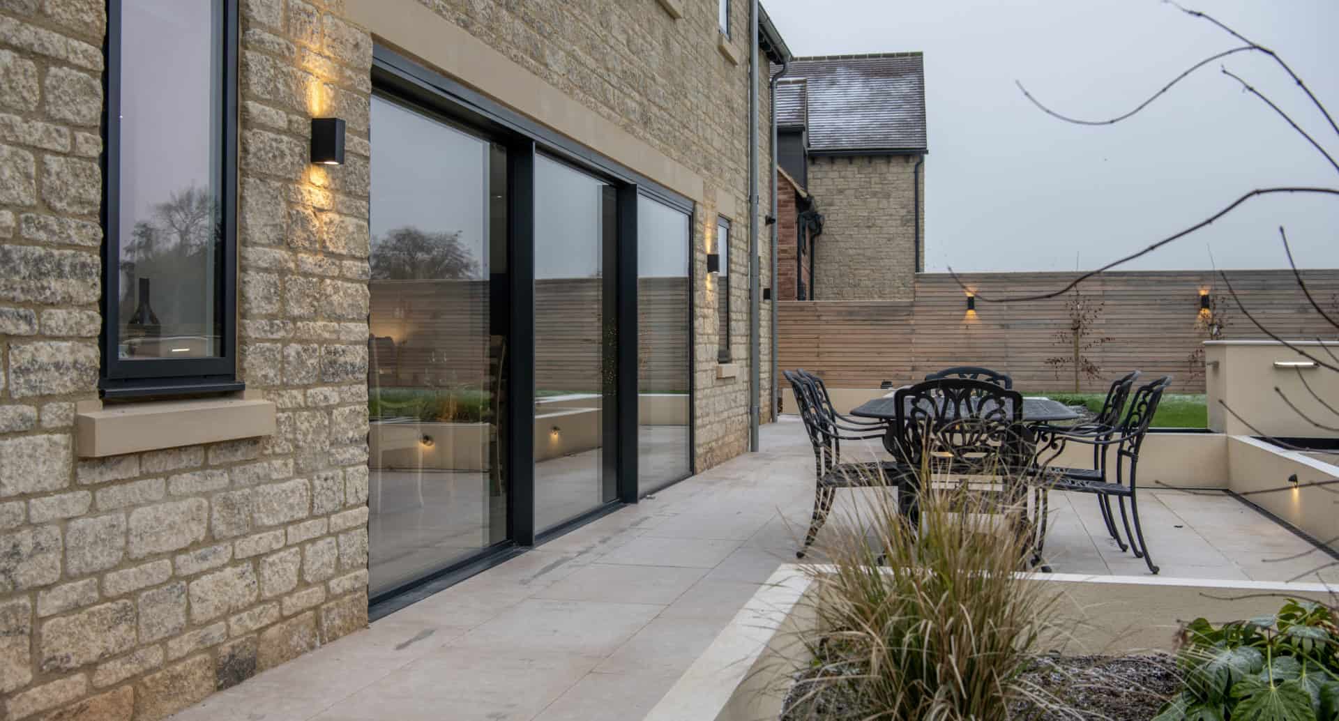 The minimal sightlines of just 25 are why sliding doors are becoming so popular in luxury housing developments such as this. An impressive façade of glass that makes the room feel bigger and brighter, whilst allowing the functionality to slide two panels to the side to instantly open the home out to the garden.