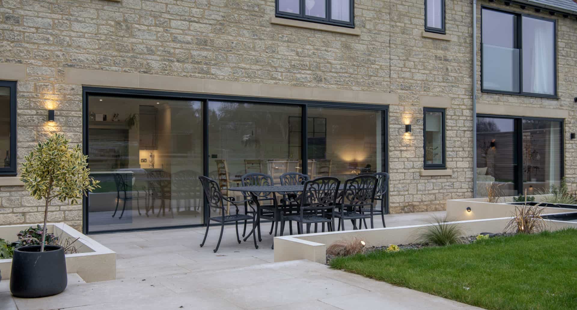 We carried out the survey alongside the building contractors from Bayswood Construction and supplied all the aluminium windows in a dual colour finish. The front elevation offers a fairly traditional aesthetic with timber structural supports, stone windows cills, and an angular bay window but the RAL colour 7021 Black Grey gives the property a distinctive look and a nice contrast to the light-coloured stone construction. Internally the white finish of the windows is softer and blends in with the internal finishings, which allows our slim framed sliding door to stand out as a central feature throughout.