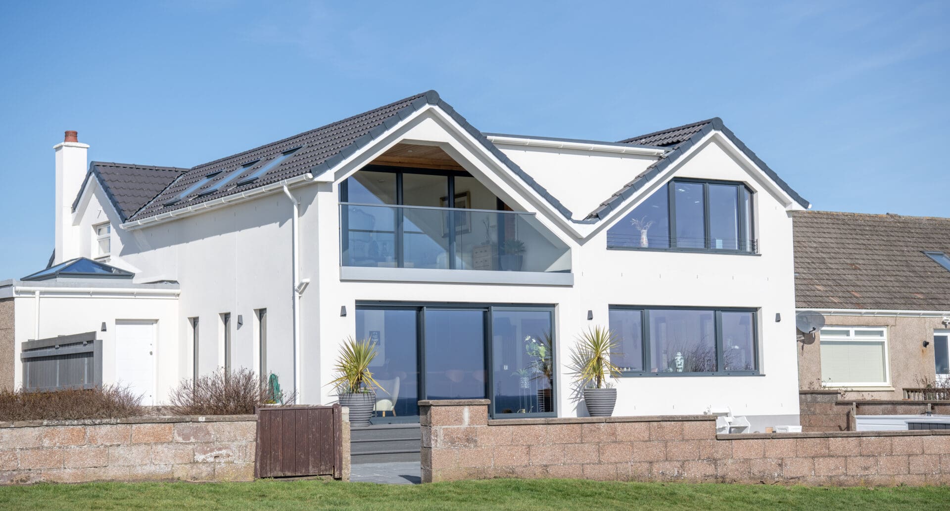 The homeowners of this sea front location decided to renovate their home whilst adding a large extension to the rear seaside elevation. They commissioned an architect to ensure that they would incorporate as much natural light into the property as possible, whilst designing the rear extension in a way that would make the most of their stunning ocean views. During consultations with their architect the homeowners visited our Glasgow showroom to examine our aluminium windows, which would eventually replace all the existing windows in the property, but also to look at our various expansive doors and windows which would play a crucial role in achieving their brief of maximising their rear ocean views.