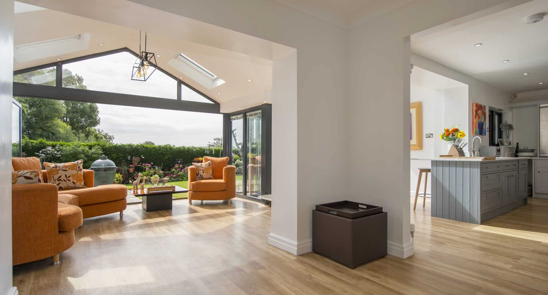 Floor to ceiling picture windows make the returns; they look great and match the bi-folds, completing the contemporary feel. On the far return, a full height window meets the bi-fold on the corner, but leading back into the house on the other side, we have manufactured a matching window above a dwarf wall which stops the side of the house feeling like a conservatory.