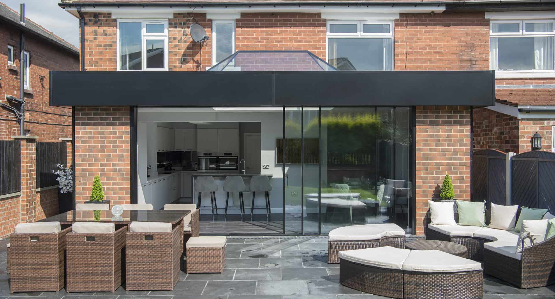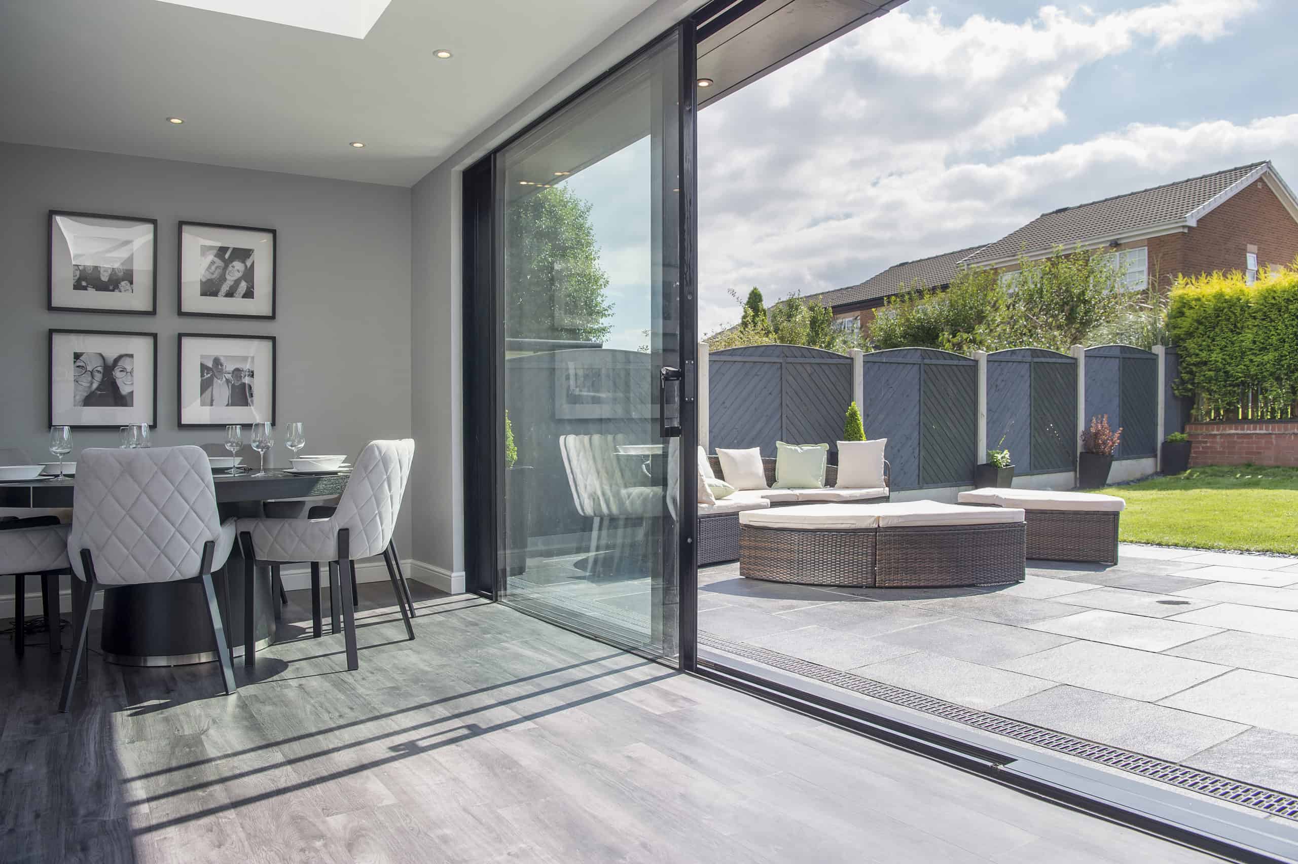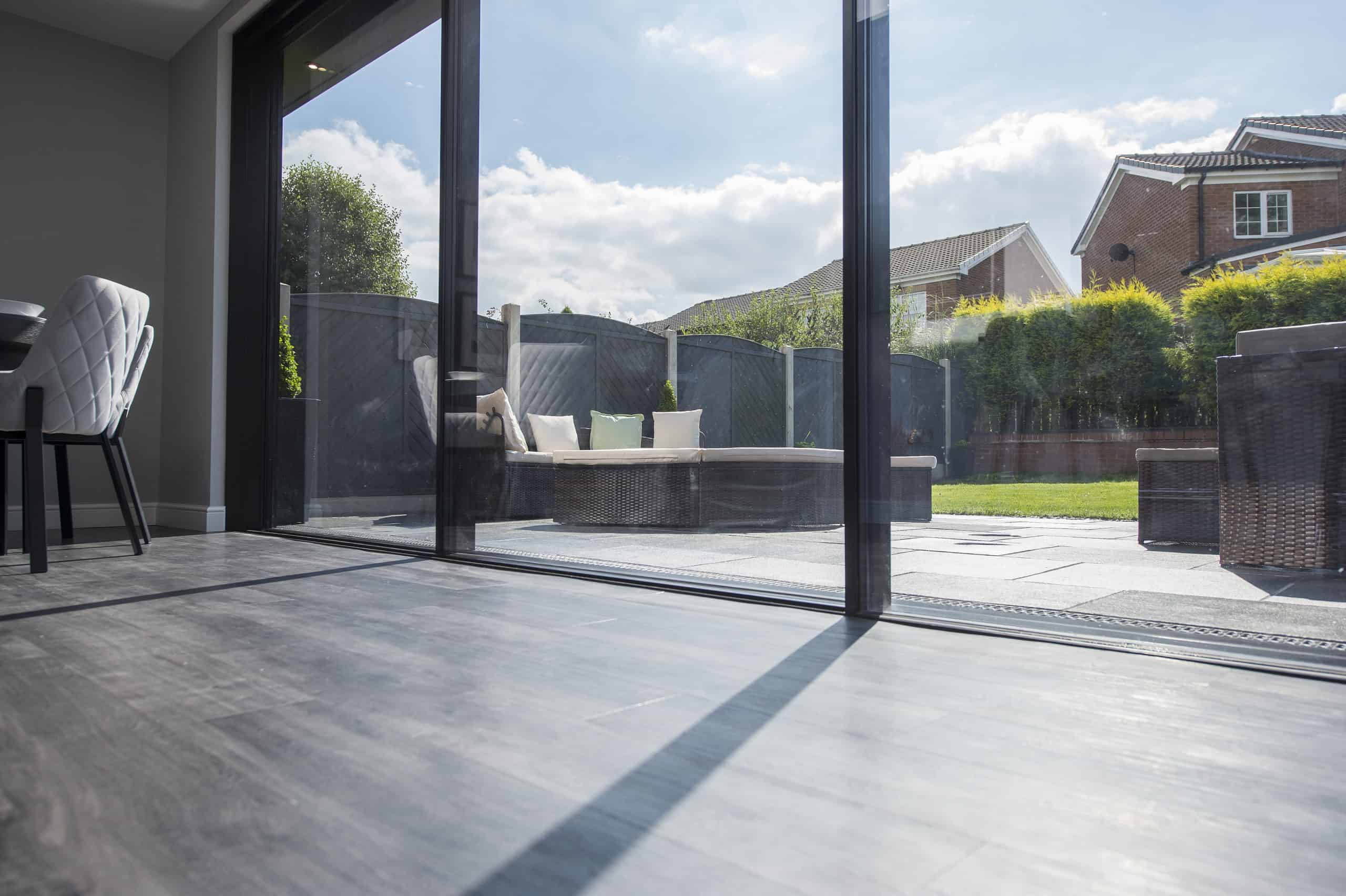 We manufactured and installed our slimmest sliding door system the XP Slide Panoramic +. The system boasts a slim-line transom of just 25mm, and a door sash that is completely concealed by the outer frame, meaning internally it has been completely concealed by plaster board around the head and sides of the door, with the bottom track buried as well. Externally the frame can be concealed also, which has been achieved here by a large fascia bulkhead that covers the head of the door. The brick to brick opening leaves the side jams of the door exposed, which even then, only has a visible sightline of just 59mm. The XP Slide Panoramic + also boasts a multi-point lock operated by a latch within the handle that locates both a shoot bolt lock into the head and foot of the door, and three additional latches that lock into the doors outer frame.