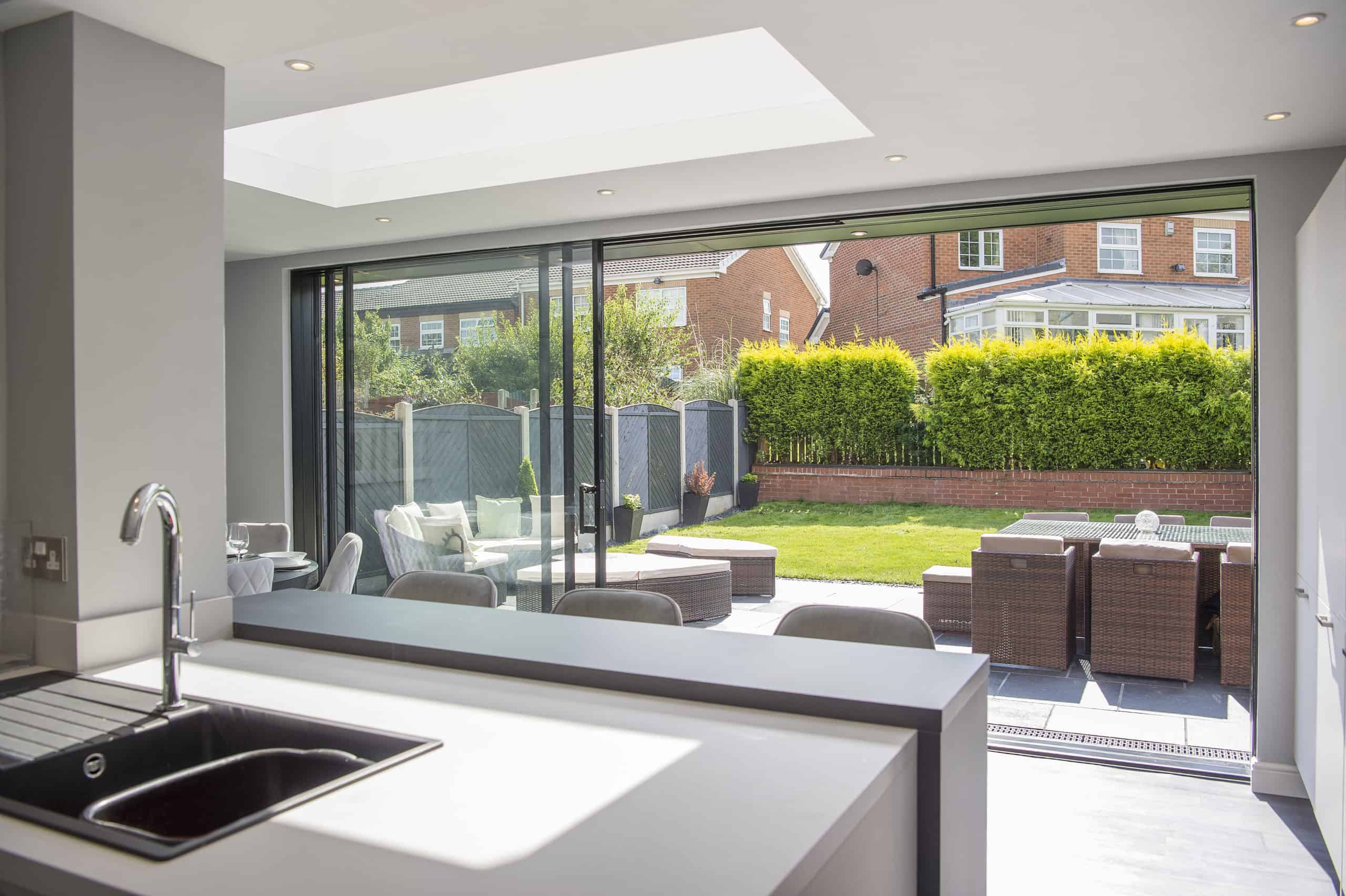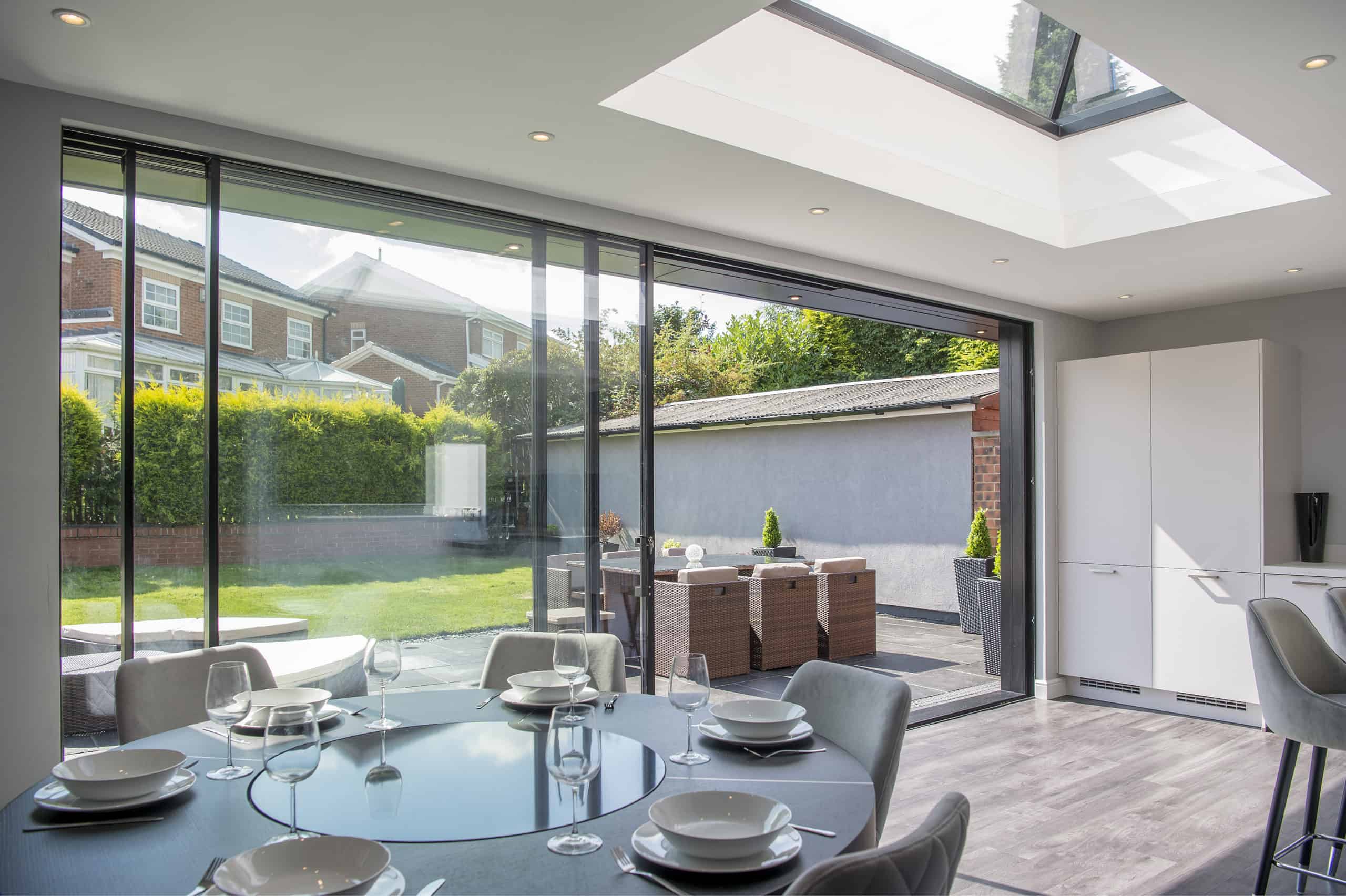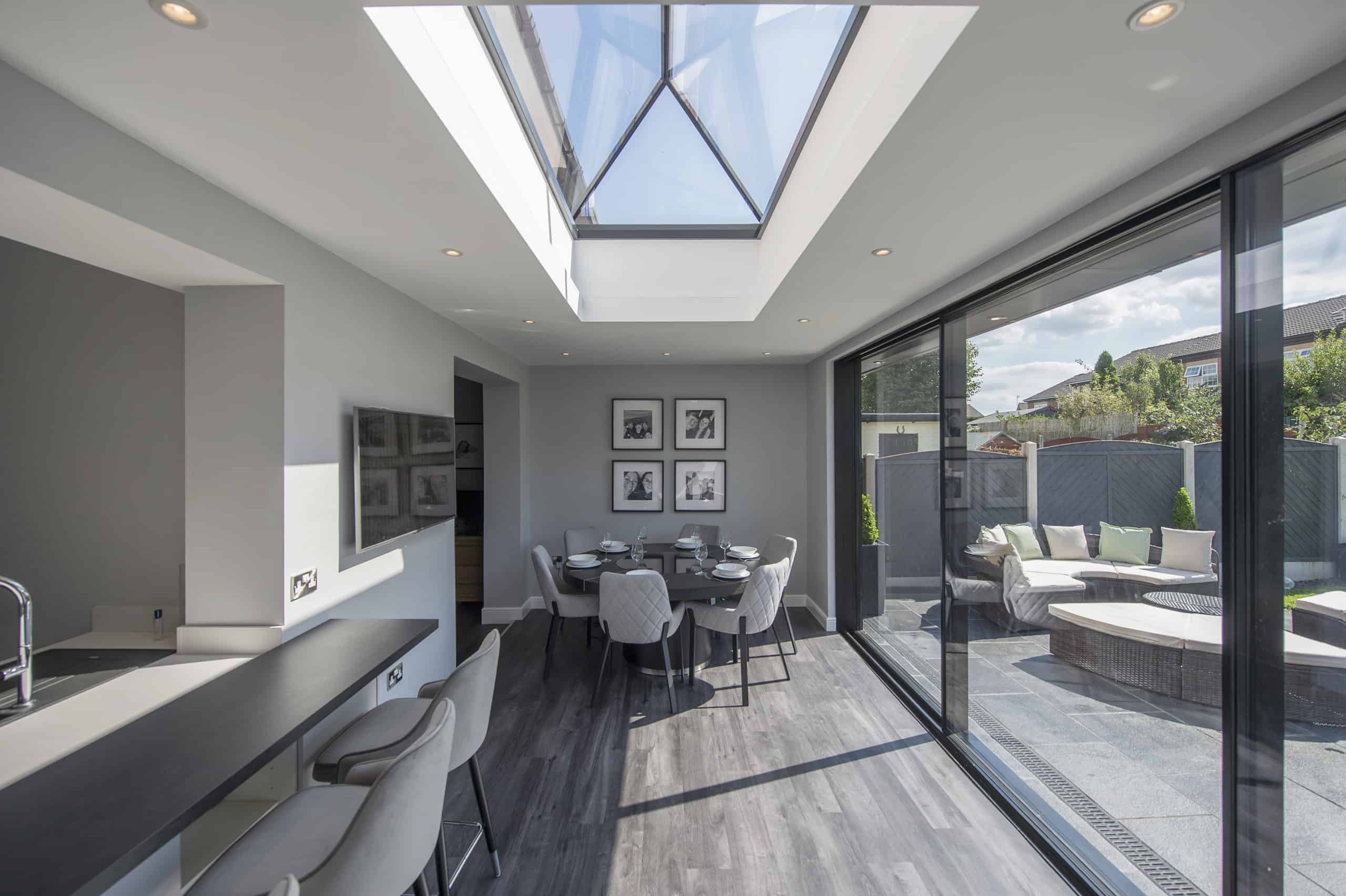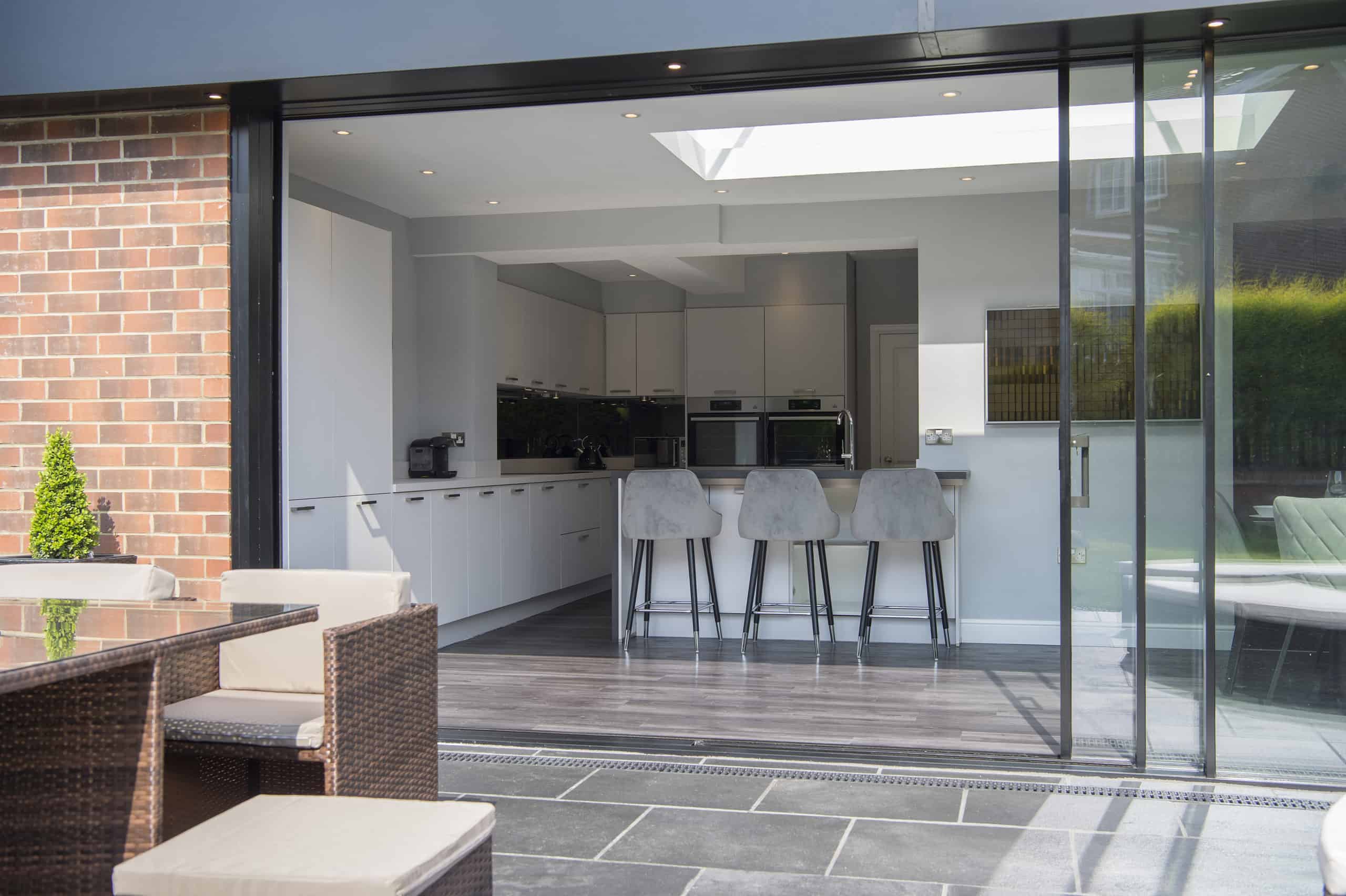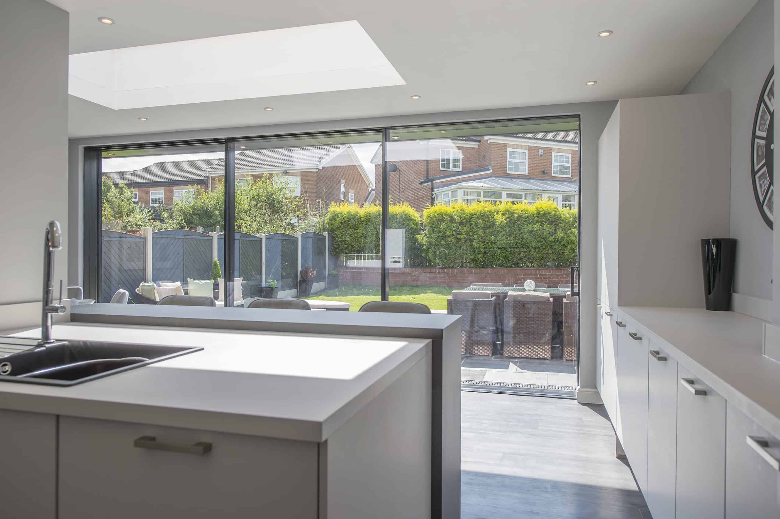 The result is a contemporary addition to this house. The two glazed products that we supplied are the key features within the design. The sliding doors are effectively a wall of glass interrupted by just two 25mm wide vertical transoms, and the pyramid rooflight follows the same theme, minimal frames and a beautiful modern appearance. This kitchen extension is light filled, with a flush walk through out to the flagged patio area outside. A flexible interior space that draws in views from the garden and effortlessly connects with it, when the thin glass doors are slid to one side.