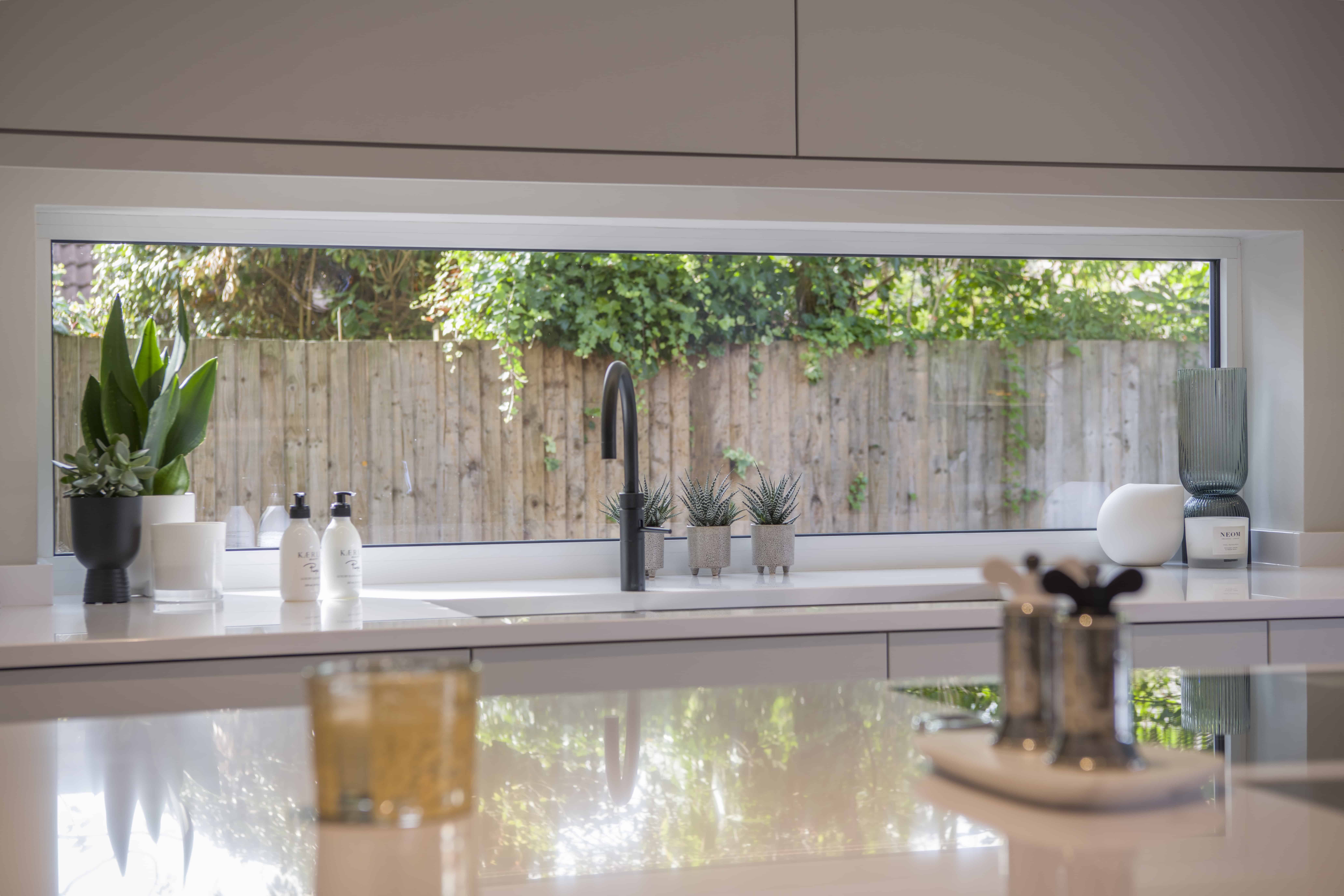 One of the simplest products we delivered was fundamental to one of the main design features in the new kitchen extension. The newly installed kitchen design incorporated a fixed picture window in between the sink the mounted wall units. The modern kitchen is banked to one side of the open-plan space and the hole cut out of the existing house allowed for a window to be centred within the new kitchen. The window ensures that natural light & framed views to the outside can be enjoyed while cooking, cleaning and most importantly whilst sat at the breakfast bar.