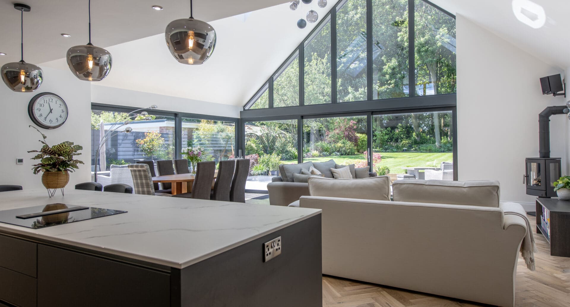 Our high specification lift and slide doors the XP Infinite were used in the new open plan living area, which is the largest addition to the existing properties footprint. Two sides of the space are glass sliding doors, the largest of which is positioned underneath a huge, shaped window. Lift and slide doors tend to have thicker profiles than our slim-line sliding doors, but the lift and slide mechanism makes them almost effortless to slide, plus they can be locked in any open position.