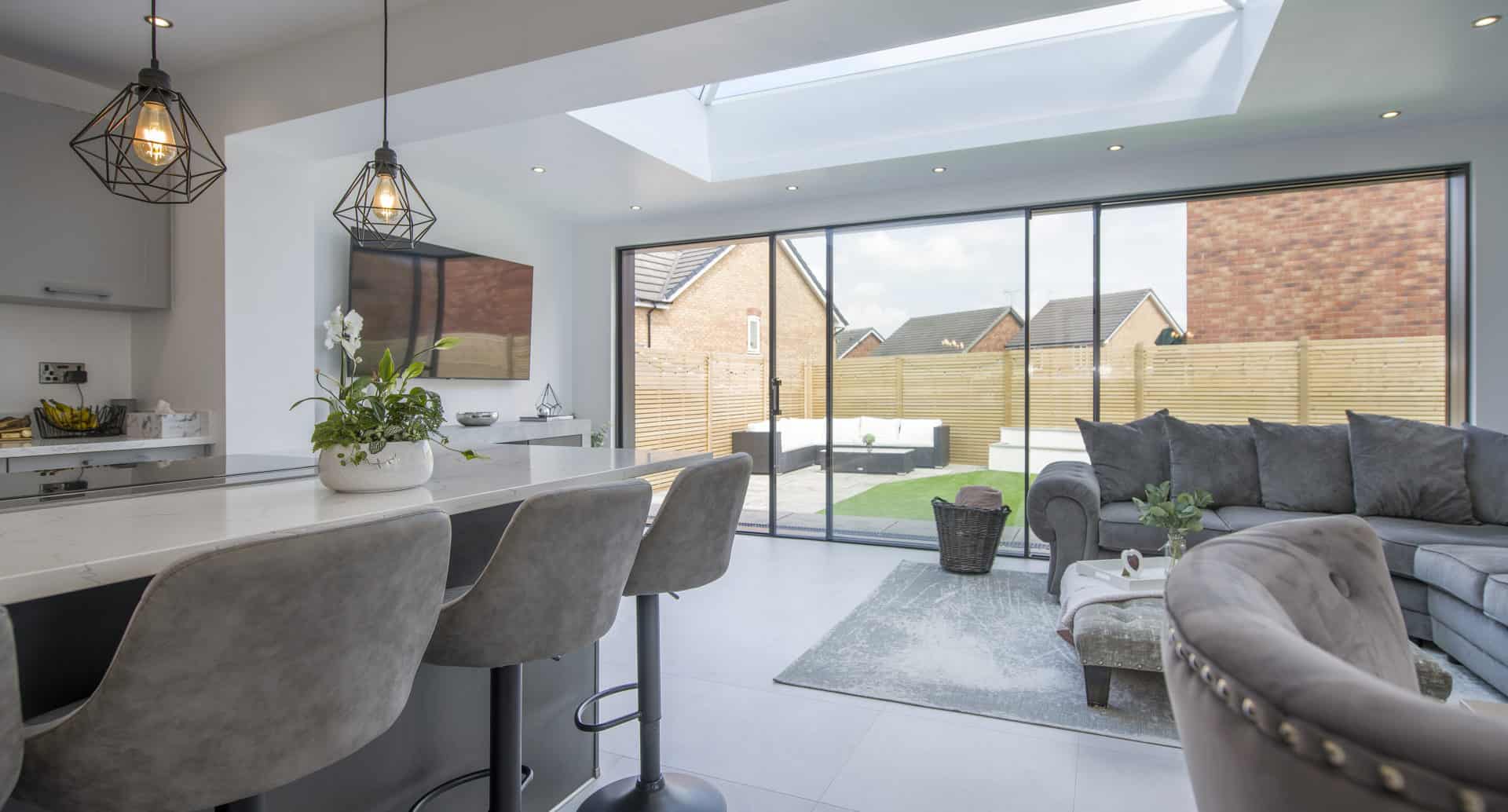 Grey sliding doors very much help to mute and offset the effects of more vibrant colours, becoming a hidden shade that works to merge different hues together for a seamless style – both inside and outside your home.